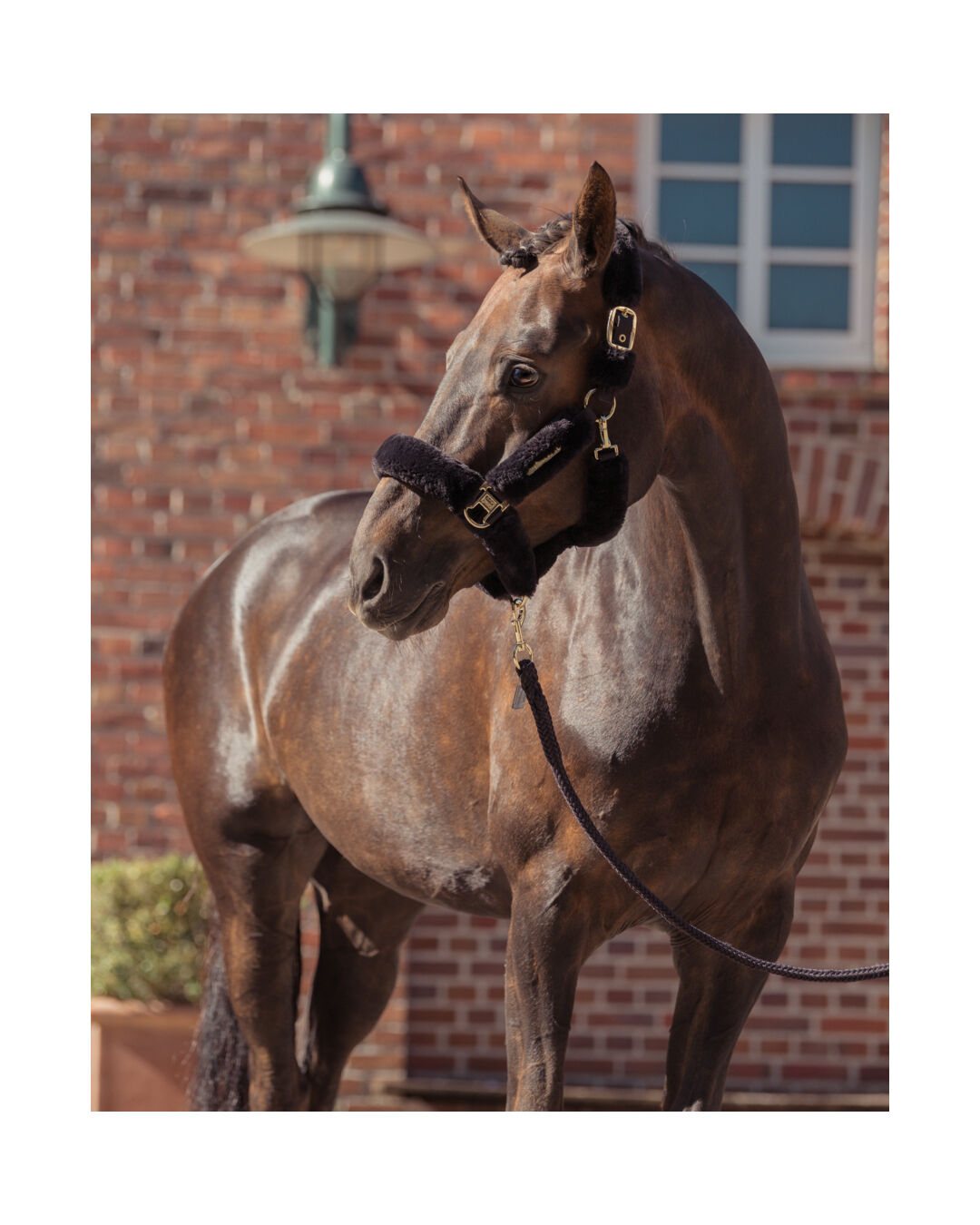 Mit beidseitigen Dornschnallenverschlüssen lässt sich die Passform individuell anpassen, sodass dein Pferd jederzeit bequem und sicher steht. Die goldenen Metallbeschläge verleihen dem Halfter einen luxuriösen Touch, während die Eskadron-Metallplakette auf der linken Seite das elegante Heritage-Design abrundet.