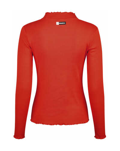 Gefertigt aus weichem Baumwoll-Ripp-Jersey liegt es angenehm auf der Haut und bietet durch seine enganliegende Passform einen besonders schönen Sitz. Der Stehkragen sowie die feinen Rüschen an Kragen-, Ärmel- und Saumabschluss verleihen dem Shirt eine verspielte, aber dennoch stilvolle Note.