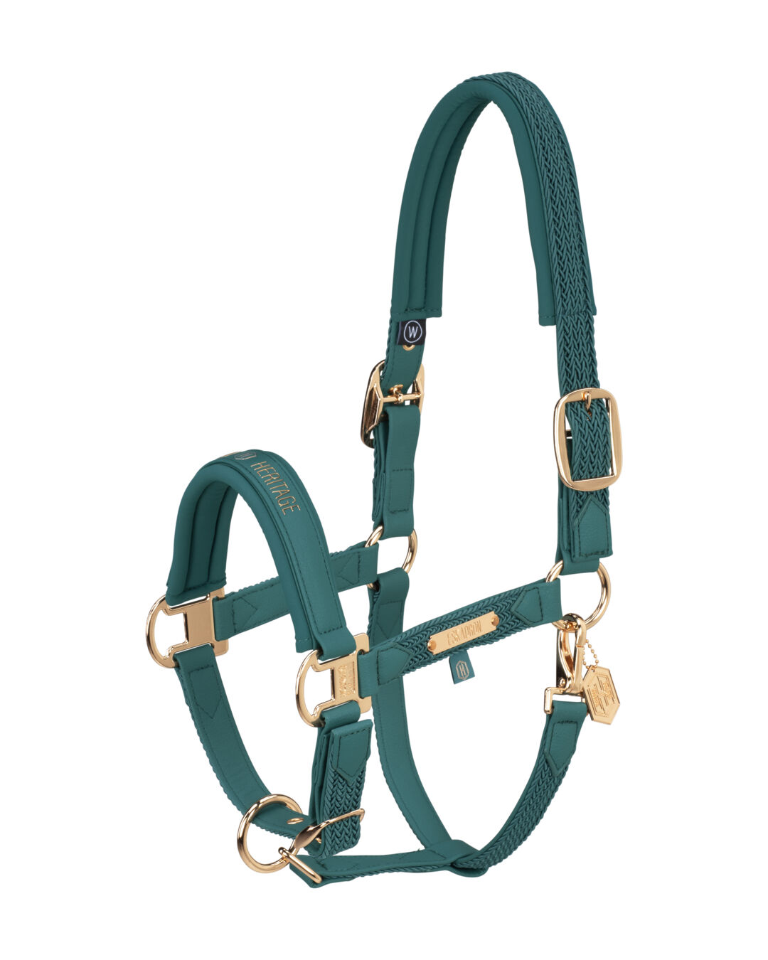 Dank der beidseitigen Dornschnallenverschlüsse kannst du das Halfter perfekt zentrieren, und die zusätzliche Verstellmöglichkeit im Kinnbereich ermöglicht eine individuelle Anpassung. Hochwertige, goldene Metallbeschläge verleihen dem Halfter einen luxuriösen Touch, während der Heritage-Schriftzug auf dem Nasenband und die Eskadron-Metallplakette auf der linken Seite das elegante Design abrunden.