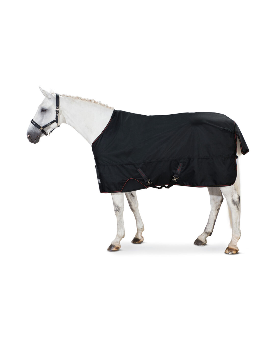 Die Gamma-Decke verfügt über eine optimierte Passform, die durch die elastische Neopren-Bewegungszone an den Vorderbeinen noch mehr Bewegungsfreiheit bietet. Ein großer Schweifprotektor und der Mähnenscheuerschutz aus Softneopren sorgen für zusätzlichen Schutz. Dank der T-Frontverschlüsse kannst du die Decke leicht an- und ausziehen, während das atmungsaktive Meshlining für Komfort sorgt und das Pferd vor Überhitzung bewahrt.