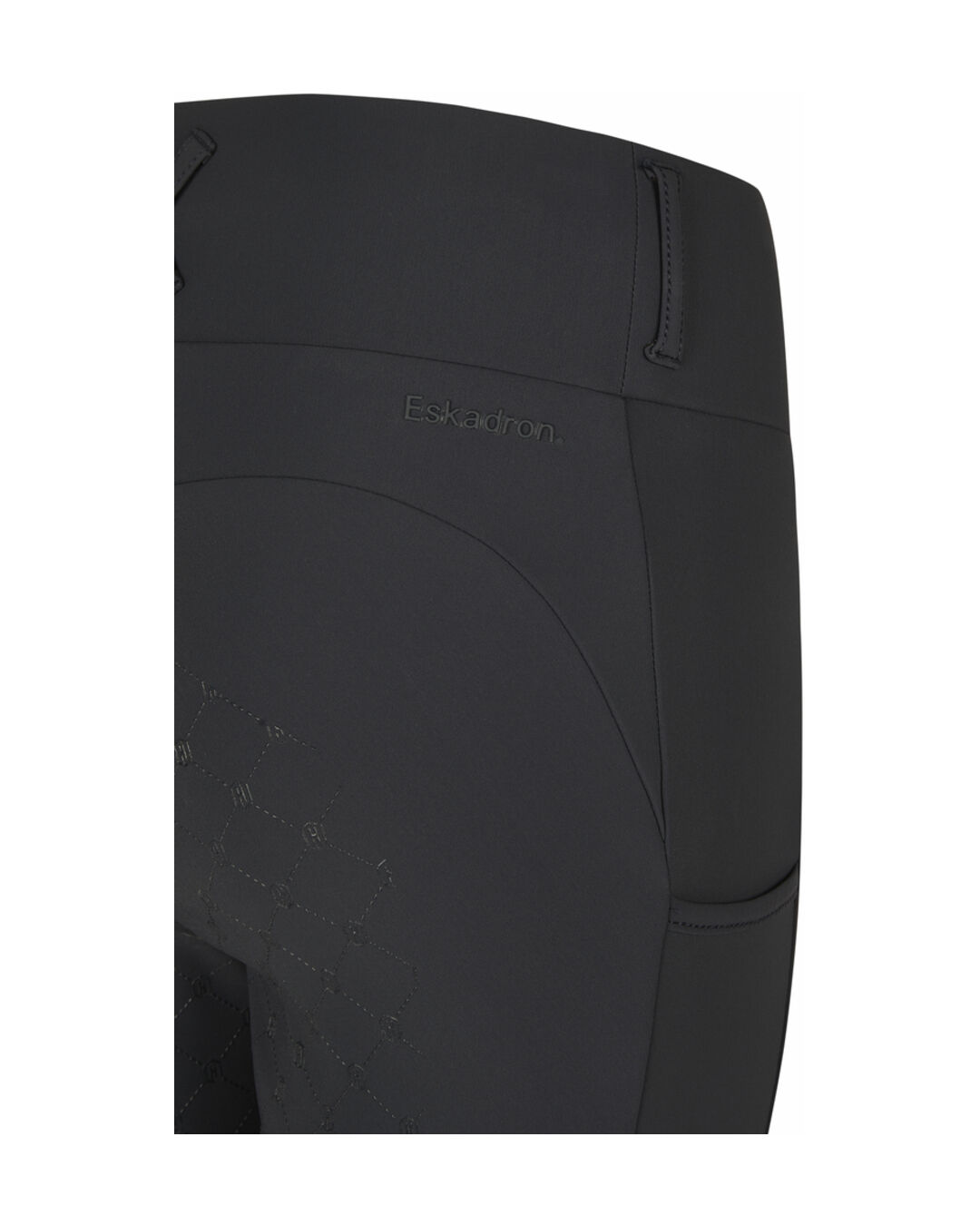 Der formgebende, breite Bund mit Gürtelschlaufen sorgt für stabilen Halt und eine schmeichelnde Passform. Beidseitige Handytaschen bieten dir praktischen Stauraum, während die Fake-Reißverschlussnähte und die geschwungene Gesäßnaht mit Eskadron-Print einen sportlich-edlen Look verleihen.