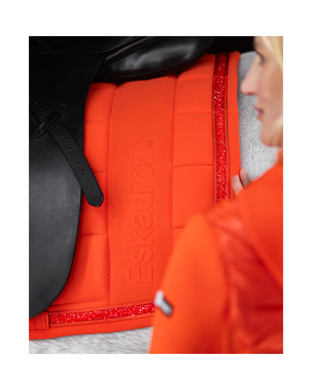 Optisch überzeugt die Schabracke mit beidseitigen Vertikalstreifen samt Eskadron-Stickerei, einer edlen Kordel–Steinchen–Kordel-Kombination sowie dem typischen Flag-Label.