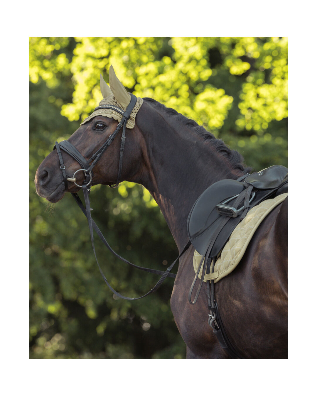 Das edle Bouclé-Obermaterial verleiht der Schabracke eine besonders hochwertige, strukturierte Optik, während die atmungsaktive Baumwoll-Waffelpiqué-Unterseite für ein angenehmes Klima und optimale Schweißaufnahme sorgt. So bleibt der Rücken deines Pferdes trocken und geschützt – auch bei längeren Trainingseinheiten.