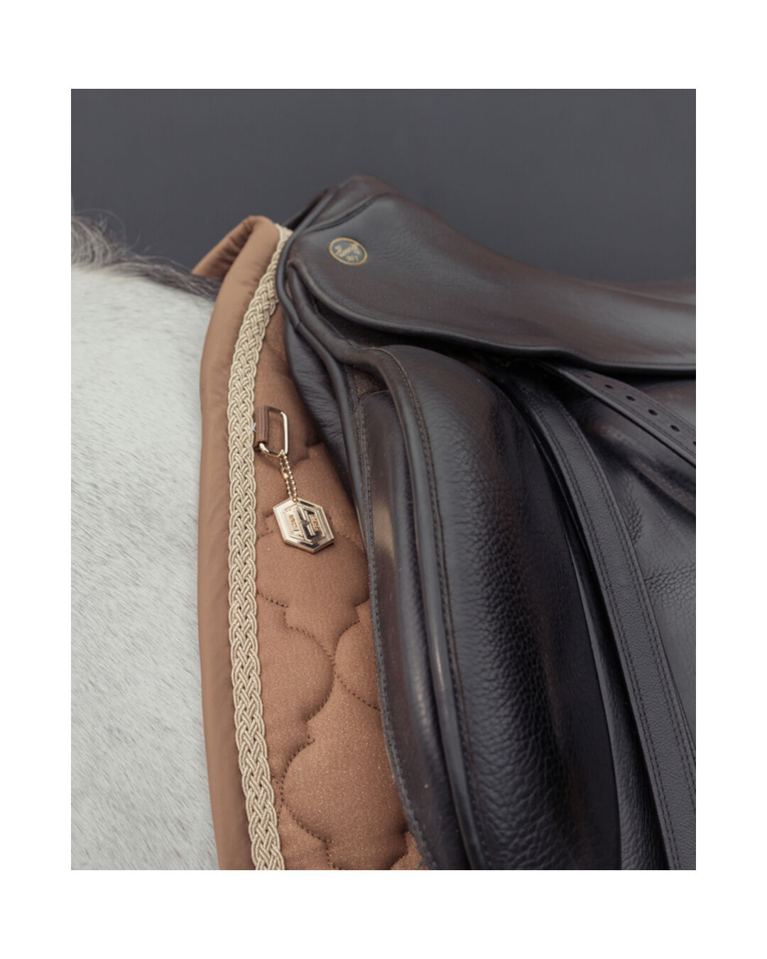 Die großzügige Steppung mit mitteldicker Füllung bietet eine optimale Polsterung. Dank der Anti-Slip Silikonflächen im Sattelbereich bleibt der Sattel sicher in Position, auch bei intensiveren Reiteinheiten. Die geflochtene Lurex-Kordel auf der glänzenden Einfassung setzt optische Akzente, die das Design zusätzlich aufwerten.