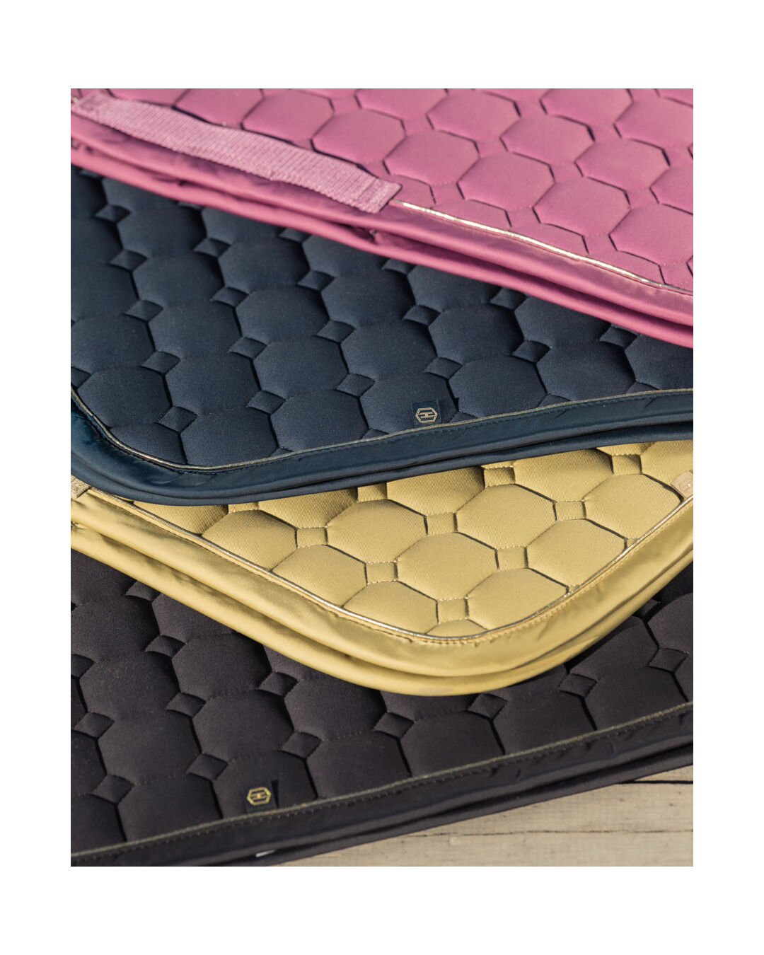 Die kompakte Füllung in Kombination mit der gleichmäßigen Steppung sorgt für eine ideale Druckverteilung und einen rutschfesten Sitz unter dem Sattel. Ein optisches Highlight sind die edle Lurex-Biese auf der glänzenden Glossy-Einfassung sowie das beidseitige Flag-Label – feine Details, die den eleganten Heritage-Look perfekt abrunden.