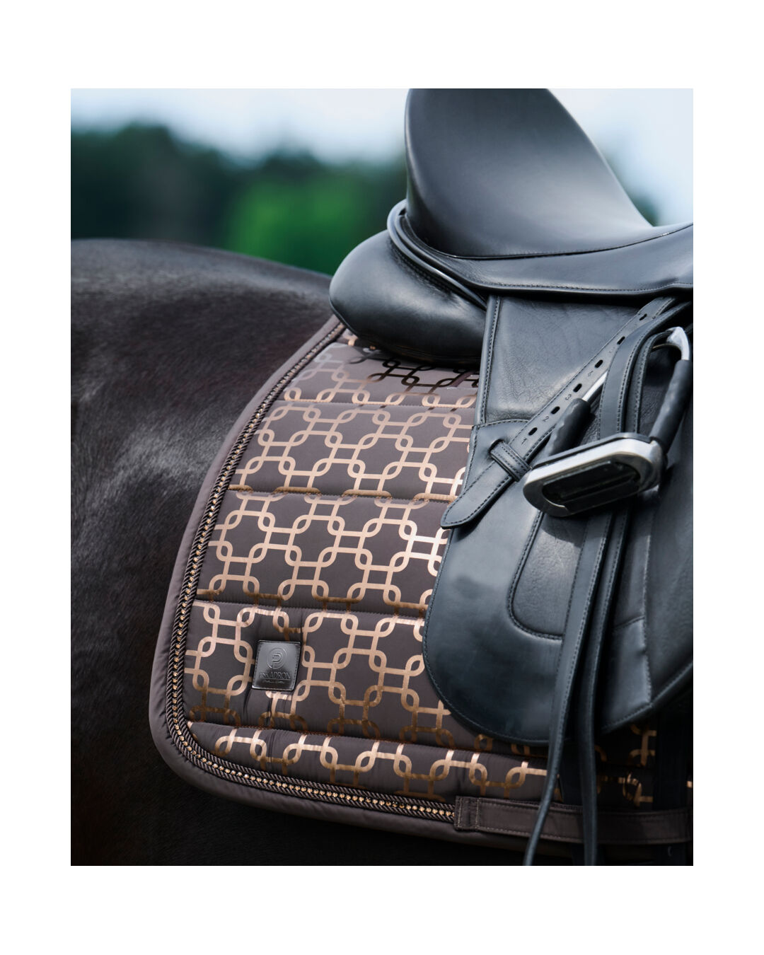 Antislip-Silikonflächen im Sattelbereich sorgen für einen sicheren Halt des Sattels und verhindern ein Verrutschen. Der schicke Chain-Allover Print und die elegante Kordel-Kristallstein-Kordel Kombination auf der Glossy-Einfassung machen die Schabracke zu einem echten Hingucker. Das Platinum-Emblem auf beiden Seiten unterstreicht die Exklusivität der Kollektion.