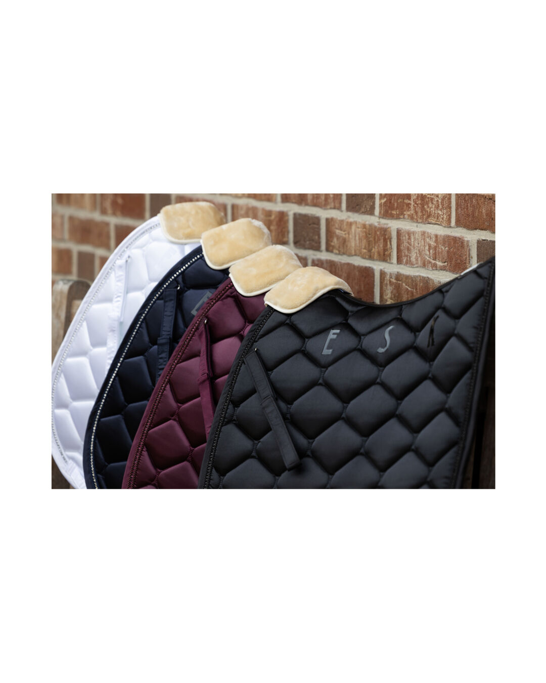 Die schön glänzende Schabracke Satin von Eskadron ist in verschiedenen Farben erhältlich. Sie besitzt ein edles Satin-Obermaterial mit voluminöser Rautensteppung und hat eine besonders atmungsaktive CoolDry-Unterseite, welche die Feuchtigkeit optimal ableitet. Das Widerristpolster ist abnehm- und waschbar, es besteht aus Kunstfell und beugt Druckstellen am Widerrist vor. Die Struppen lassen sich ganz einfach mittels Klettverschluss fixieren, genauso wie die Gurtstrippen, die du mittels dreifacher Fixierungsoption festzurren kannst. Auf der oberen Hälfte der Schabracke Satin befinden sich Antislip-Silikonflächen, damit die Schabracke unter dem Sattel nicht hin- und herrutscht – das diese Details machen die Schabracke nicht nur optisch sondern auch funktional ansprechend. Auf beiden Seiten ist ein aufgenähtes Eskadron-Emblem platziert.