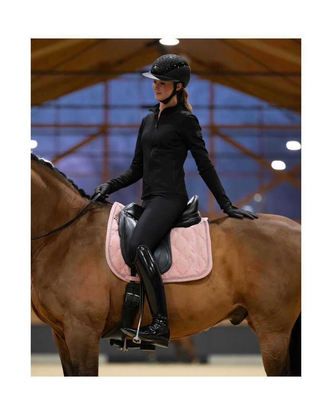 Das robuste Velours-Obermaterial sorgt für eine elegante Haptik, ist aber gleichzeitig widerstandsfähig genug für den täglichen Einsatz. Die Cool-Dry Unterseite unterstützt ein gutes Klima auf dem Pferderücken, selbst bei längeren Trainingseinheiten. Die mitteldicke Füllung mit aufwendiger Steppung bietet eine angenehme Polsterung, ohne aufzutragen.