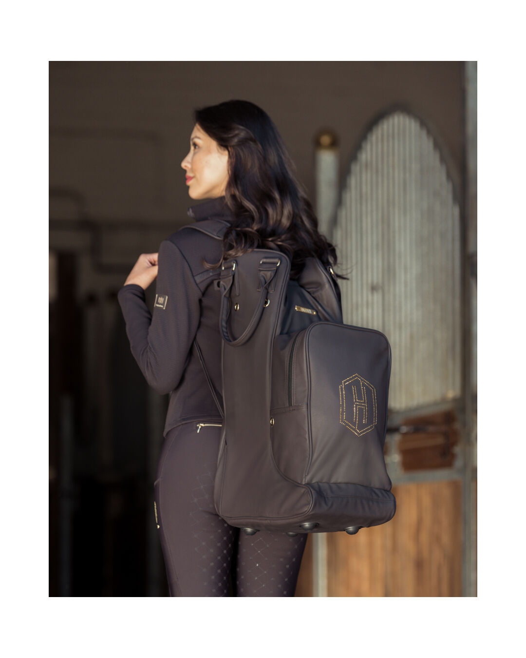 Außen bietet ein Gertenfach zusätzlichen Stauraum, während die robusten Kunststoff-Noppen am Taschenboden Schutz und Stabilität garantieren. Dank Trageriemen und zwei verstellbarer Schultergurte kannst du die Tasche bequem tragen – ob auf dem Turnier oder im Alltag. Das funkelnde Heritage-Kristall-Emblem und goldene Metallbeschläge runden das luxuriöse Erscheinungsbild stilvoll ab.