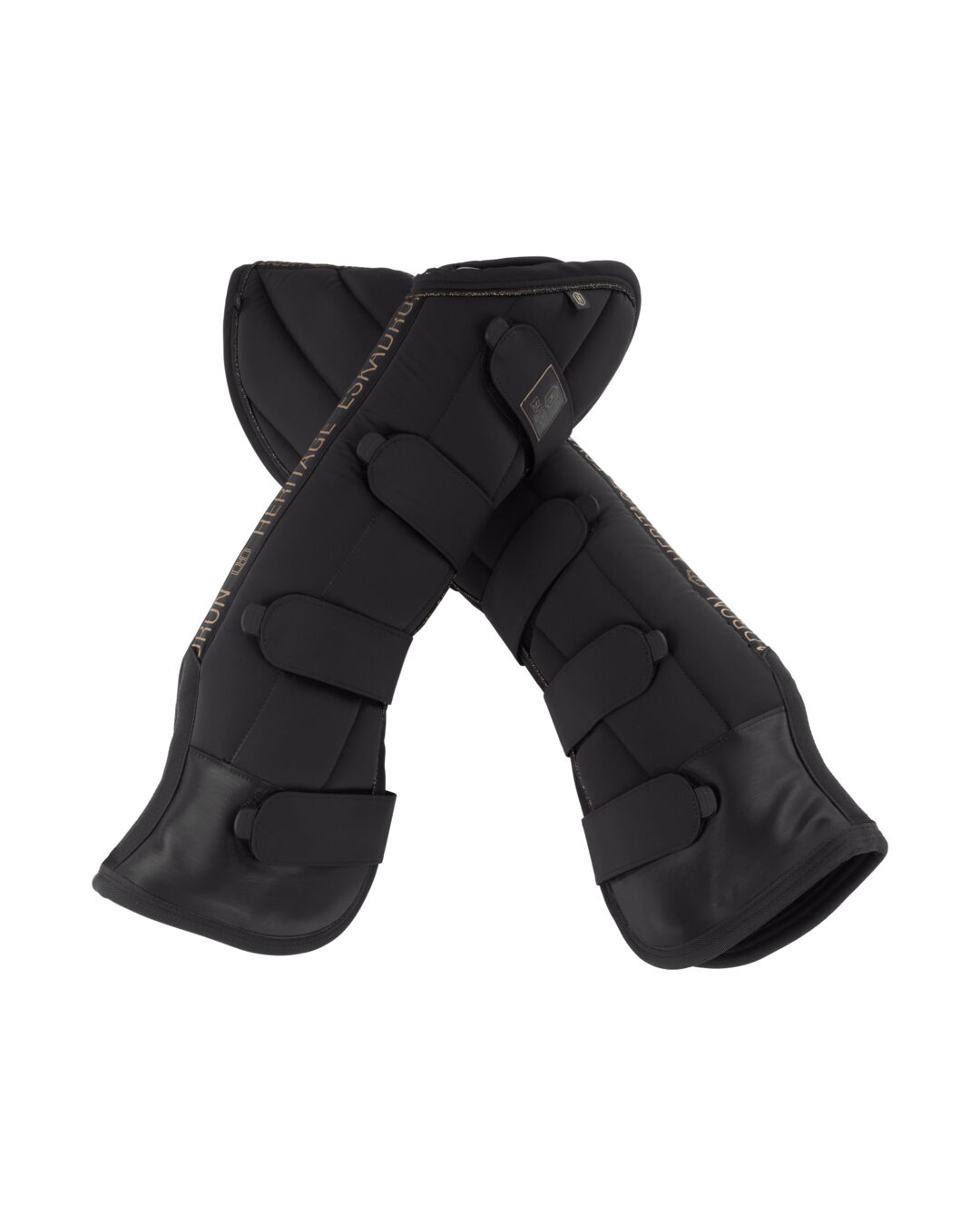 Dank mehrerer Klettverschlüsse lässt sich die Gamasche individuell anpassen. Die robuste Softslate-Verstärkung im Hufbereich vorne und hinten sorgt für zusätzlichen Schutz, während die edle Lurex-Biese und der dekorative Heritage-Print im hinteren Bereich das Design abrunden. Diese Gamaschen bieten eine ideale Druckverteilung und Dämpfung, um dein Pferd beim Transport optimal zu schützen.