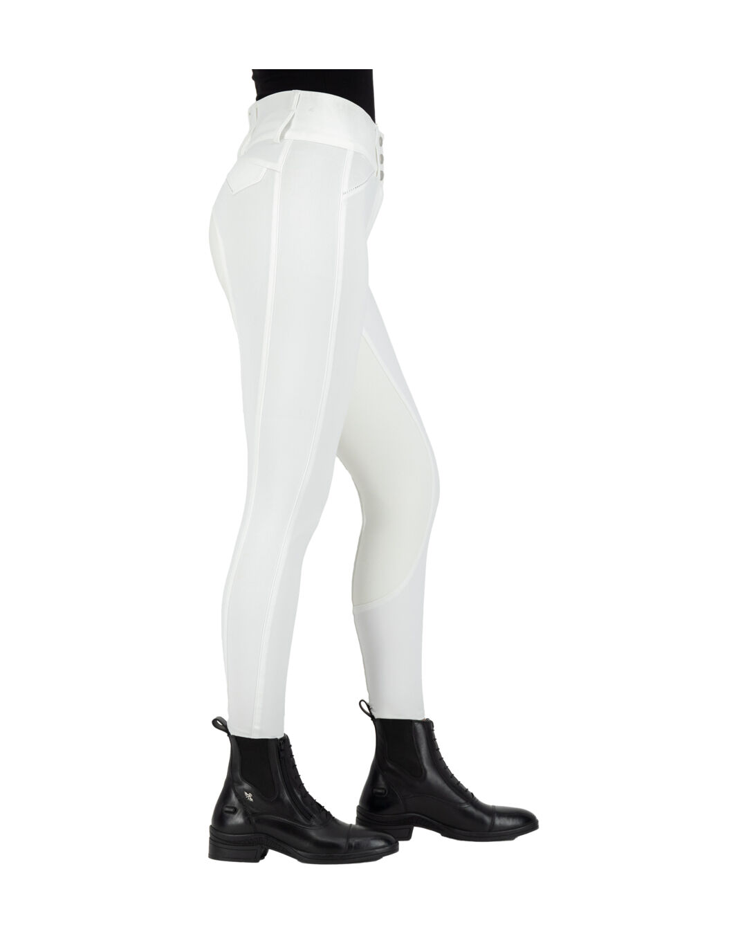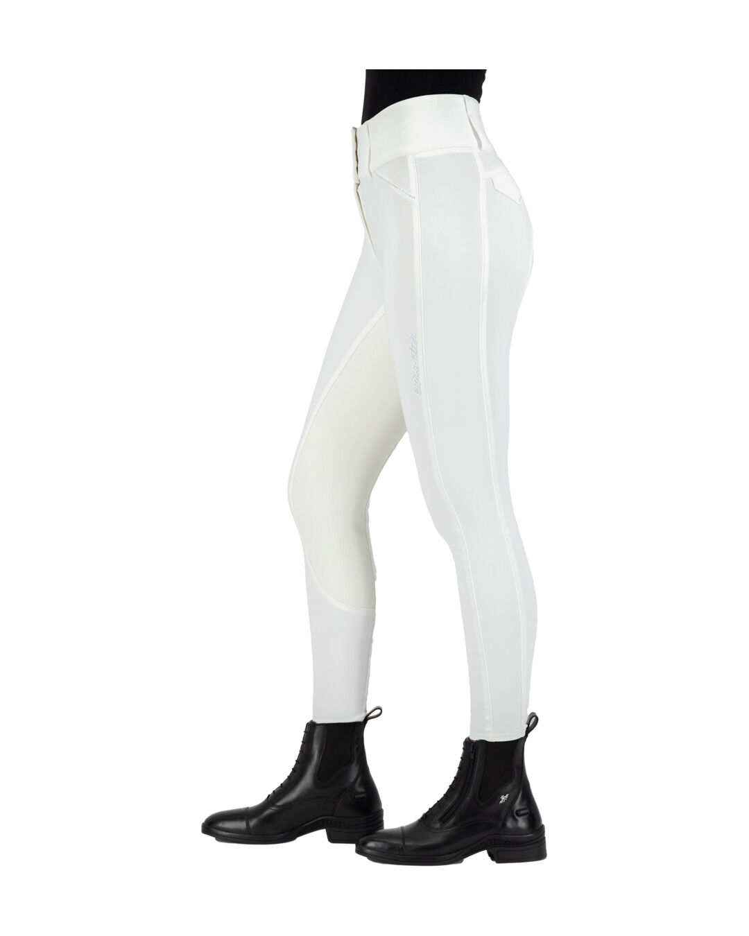 Diese Reithose besticht durch ihre hohe Taille und einen sicheren Verschluss mit drei Karabinerhaken an der Taille, die für eine perfekte Passform sorgen. Die formgebenden Fake-Taschen auf der Vorderseite sind subtil mit einer Reihe von Strasssteinen bedeckt, was der Hose eine elegante Note verleiht. Praktische Handytaschen an den Seiten bieten zusätzlichen Stauraum, und das Strass-Pferdekopf-Logo auf der Handytasche setzt einen besonderen Akzent.