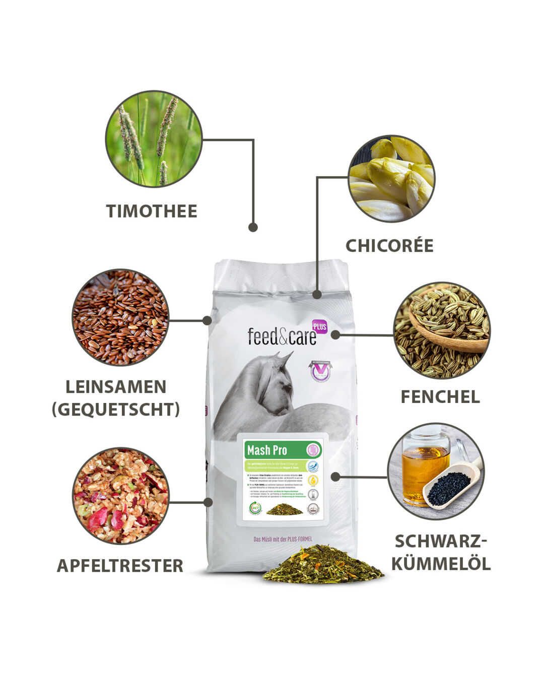 | Fütterungshinweis: | feed&care Mash Pro mit warmem (40 °C) oder kaltem Wasser mischen. Verhältnis: 250 g zu 1 l Wasser. Für ein 500 kg Pferd bedeutet das: 750 g zu 3 l. 10–15 min. quellen lassen und anschließend schnell verfüttern. Nicht kochen, um Vitalstoffe zu bewahren. |