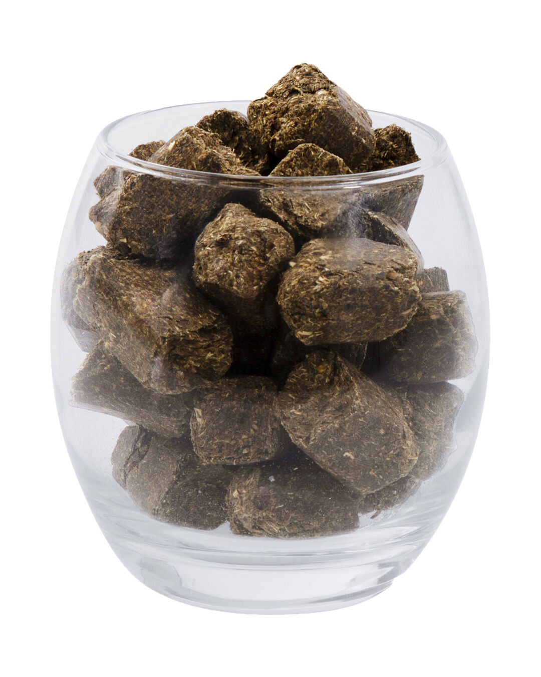 Diese getreidefreien Leckerlis bieten ein unwiderstehliches Kräuteraroma, das aus einer Mischung von 30 verschiedenen Gras- und Kräuterarten wie Wiesenfuchsschwanz, Rotschwingel und Rotklee besteht. Die Kräuter Crispies sind ideal für Pferde, die eine getreidefreie Ernährung benötigen oder bevorzugen.