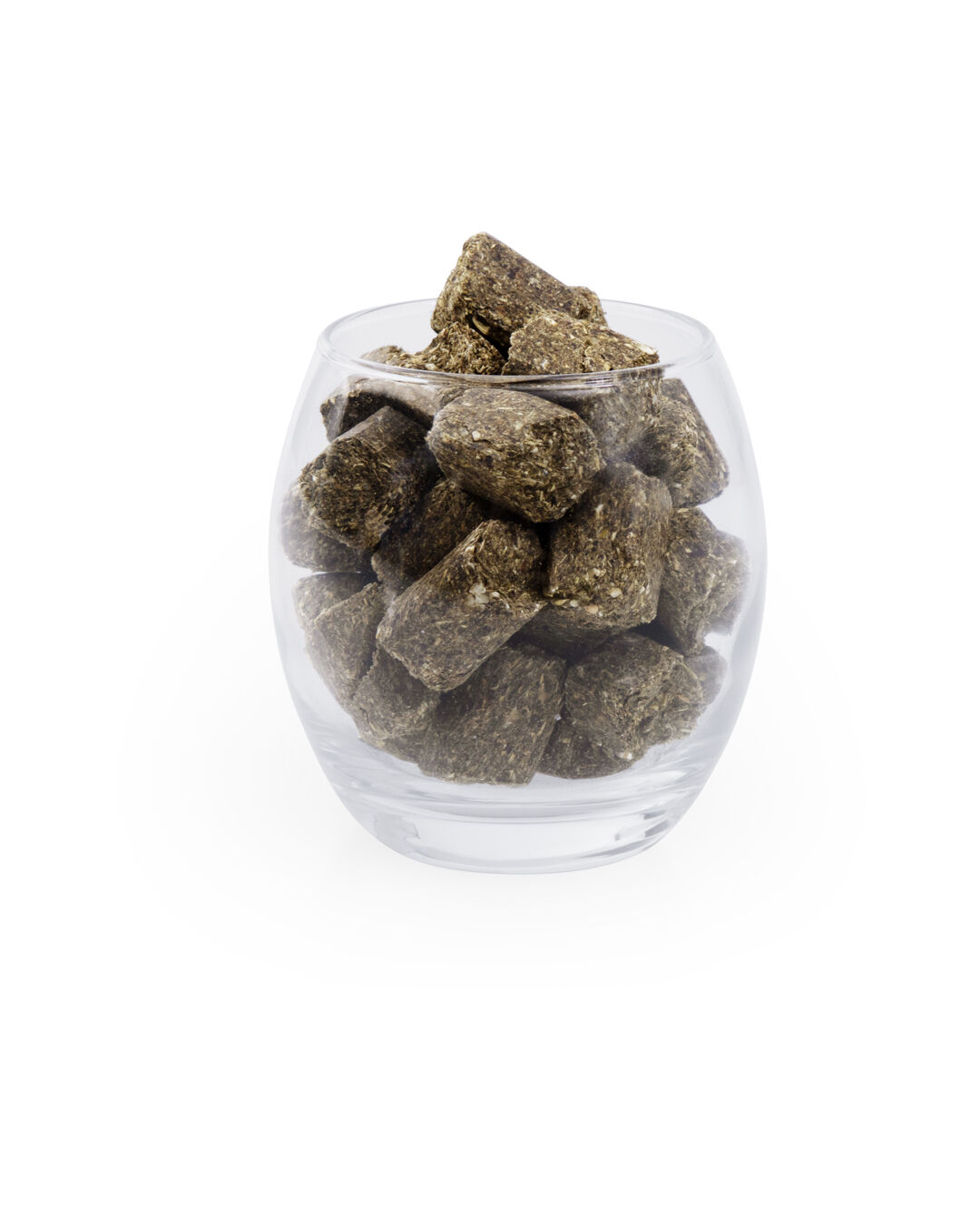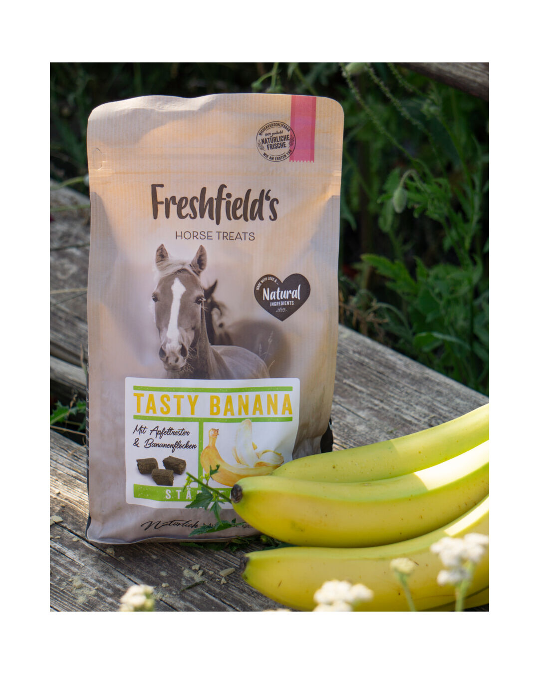 Die Tasty Banana sind stärkearme Leckerlis mit Apfelresten und Bananenflocken. Um die Leckerlis besonders schmackhaft zu machen, beinhalten sie 30 verschiedene Gras- und Kräuterarten wie Wiesenfuchsschwanz, Rotschwingel, Spitzwegerich, Kammgras, Wiesenrispe, Rotklee und Wiesenkümmel.