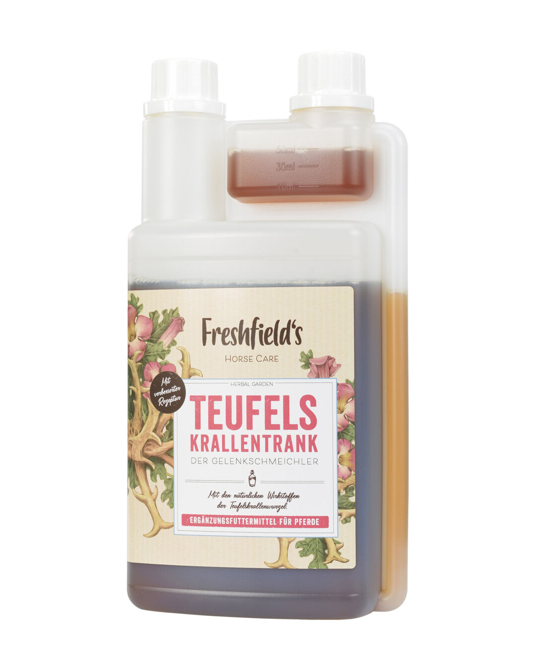 Der Teufelskrallentrank der Marke Freshfield’s unterstützt mit seinen natürlichen Wirkstoffen der afrikanischen Teufelskrallenwurzel und Honigkraut den Gelenkstoffwechsel deines Pferdes.