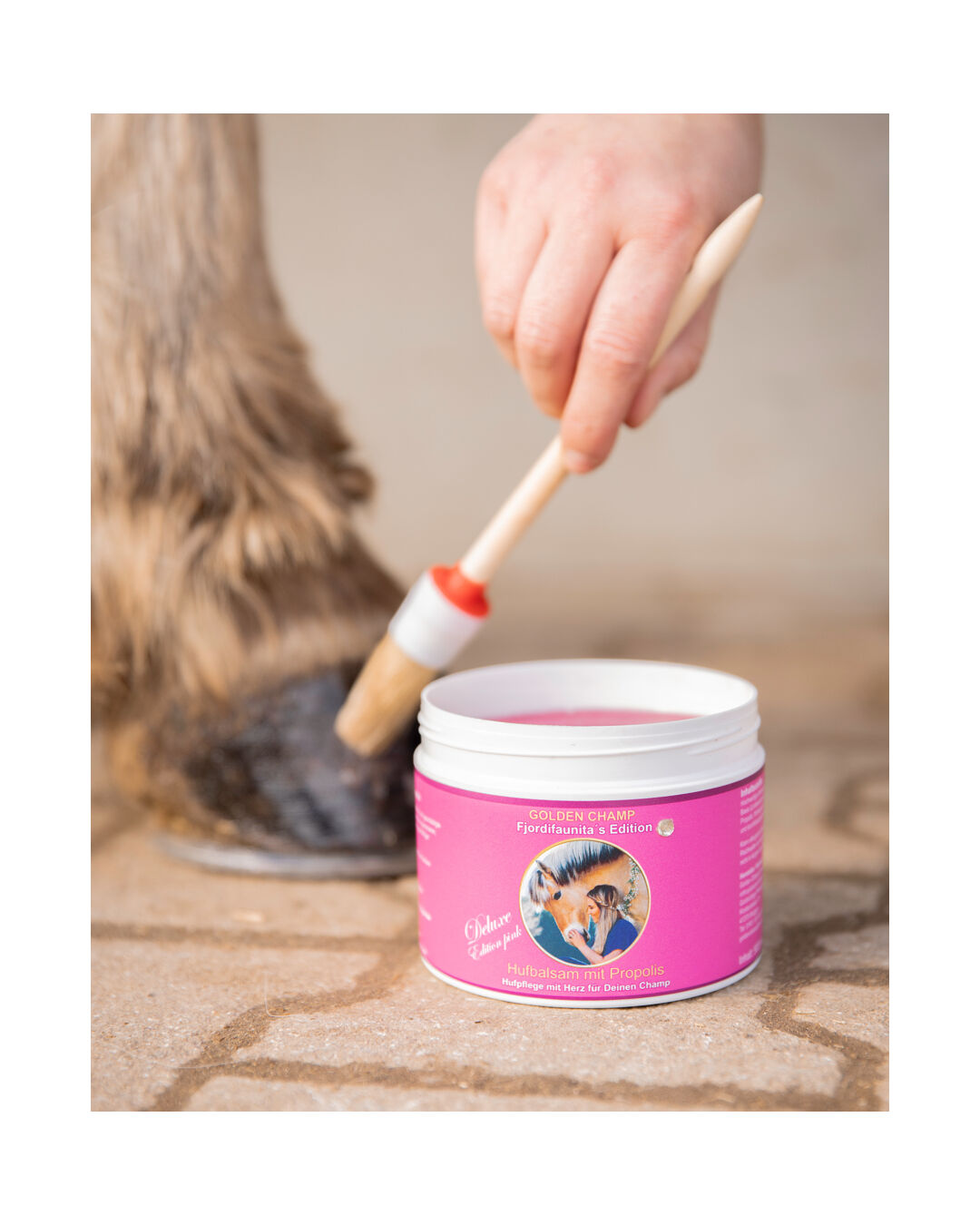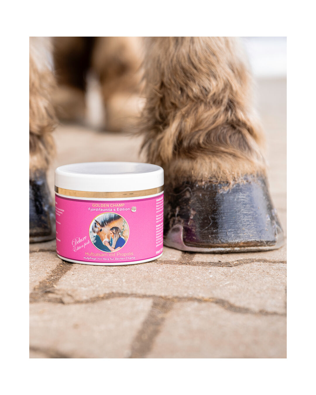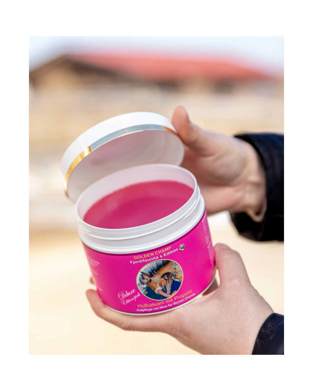 Der pinke Hufbalsam mit Propolis Fjordifaunitas Edition von Golden Champ bringt nicht nur Farbe in den Stall, sondern auch intensive Pflege für die Hufe deines Pferdes.