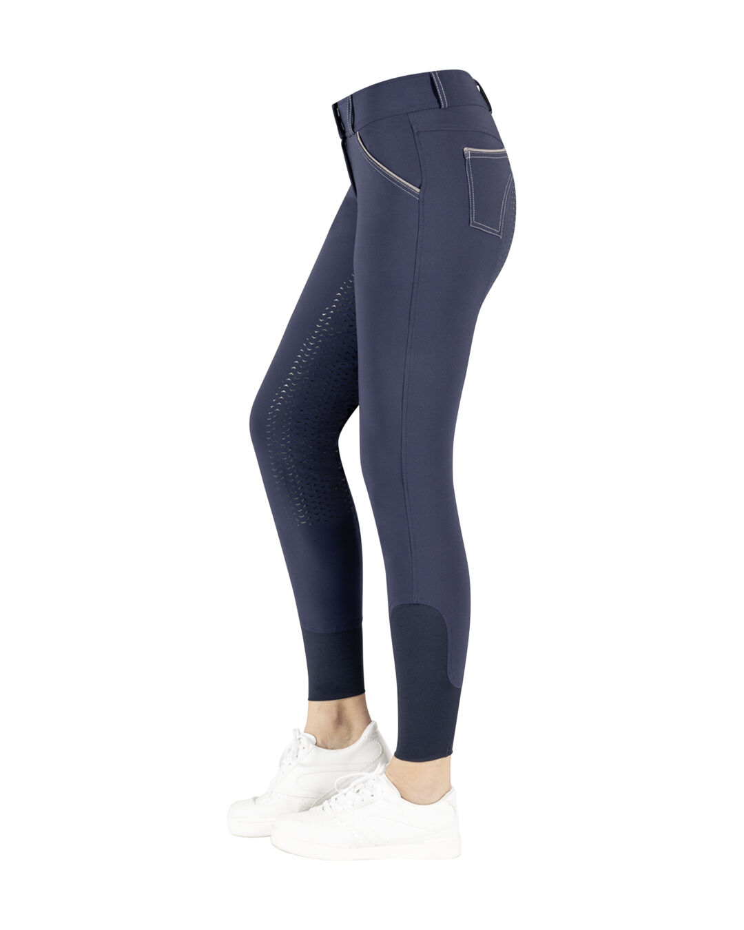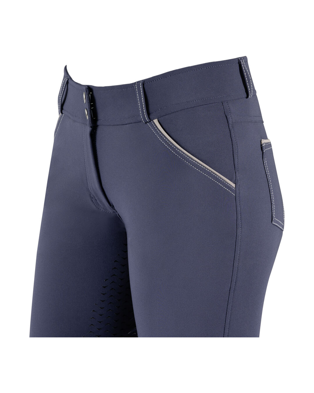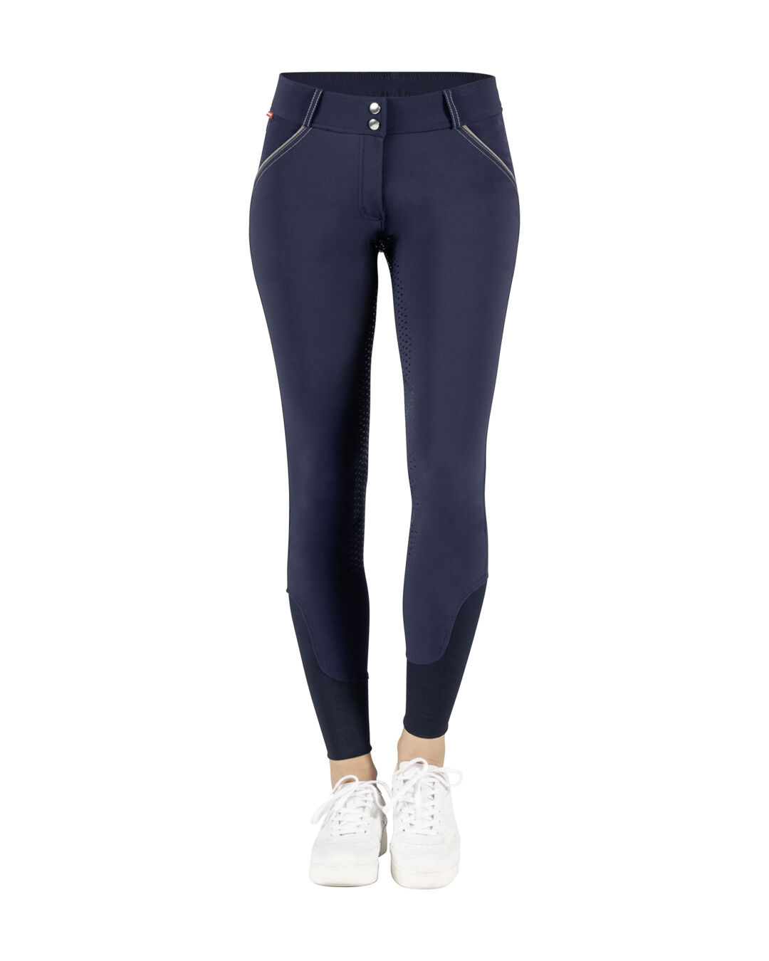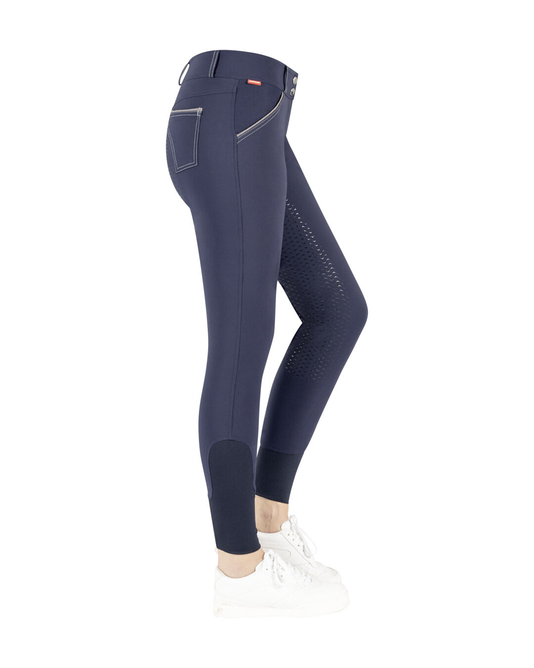 Die neue Vollgrip Damen-Reithose Sporty von GOLDHORSE überzeugt durch besonders hohen Komfort und ein sportives Design. Das leichte und elastische Material, der flexible Beinabschluss sowie der hohe stabilisierende und extra breite Bund der Reithose bieten höchsten Tragekomfort. Optische Highlights sind die farblich abgesetzten Nähte und die hinten aufgesetzten Einschubtaschen des ansonsten sehr klassischen Reithosenmodells. Besonders praktisch sind auch die weiteren Einschubtaschen auf der Vorderseite und der Vollbesatz Silikon-Grip der Damen-Reithose sorgt für einen optimalen Halt im Sattel.