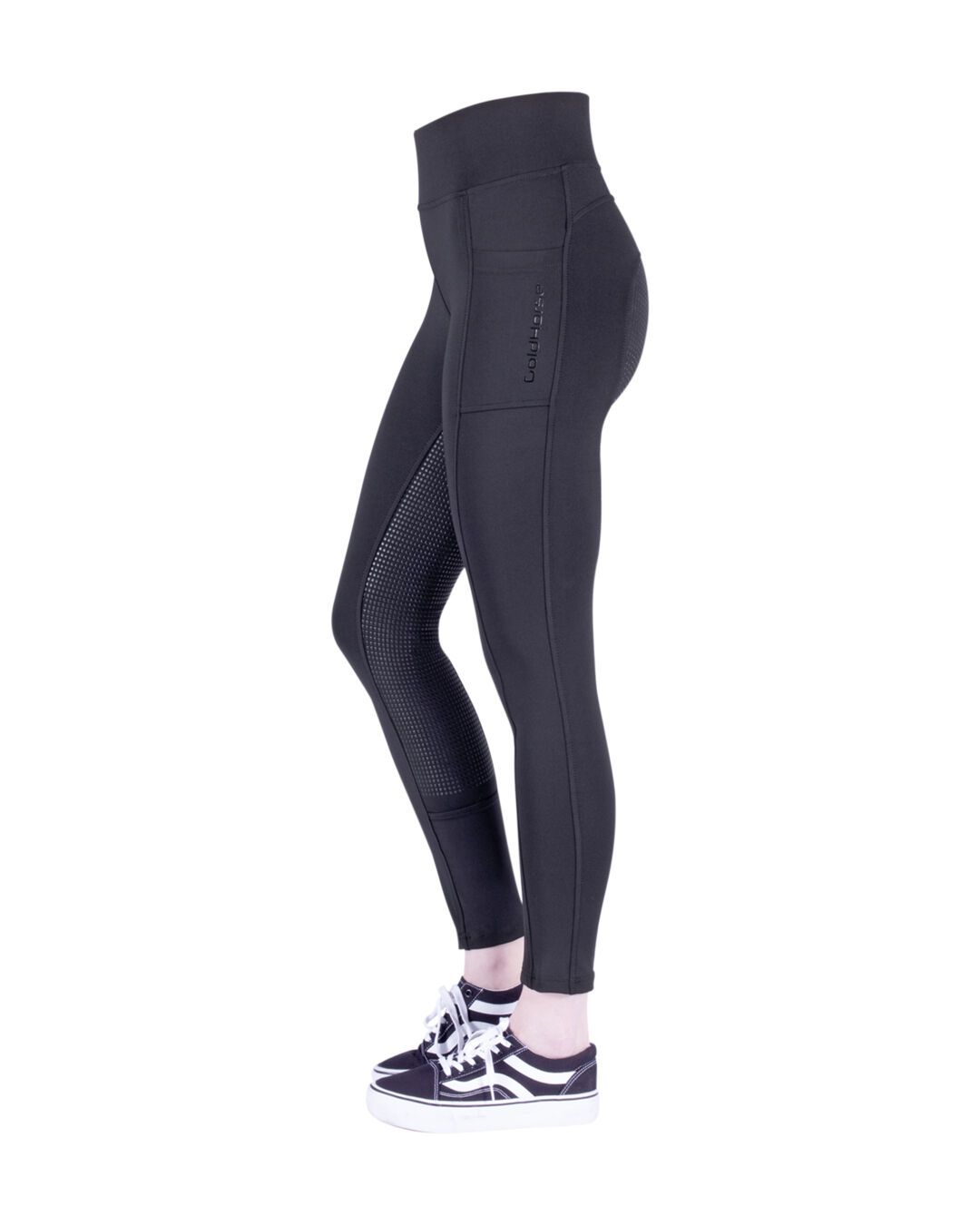 Der Silikon-Vollbesatz sorgt für stabilen Halt im Sattel, während das elastische Material jede Bewegung mitmacht. Der breite, elastische Hosenbund bietet dir zusätzlichen Komfort und einen sicheren Sitz, ganz ohne Einschneiden oder Verrutschen. Besonders praktisch: die seitliche Handy-Einschubtasche – mit glänzendem GOLDHORSE-Logo – in der du dein Smartphone sicher unterbringst, ohne dass es stört.