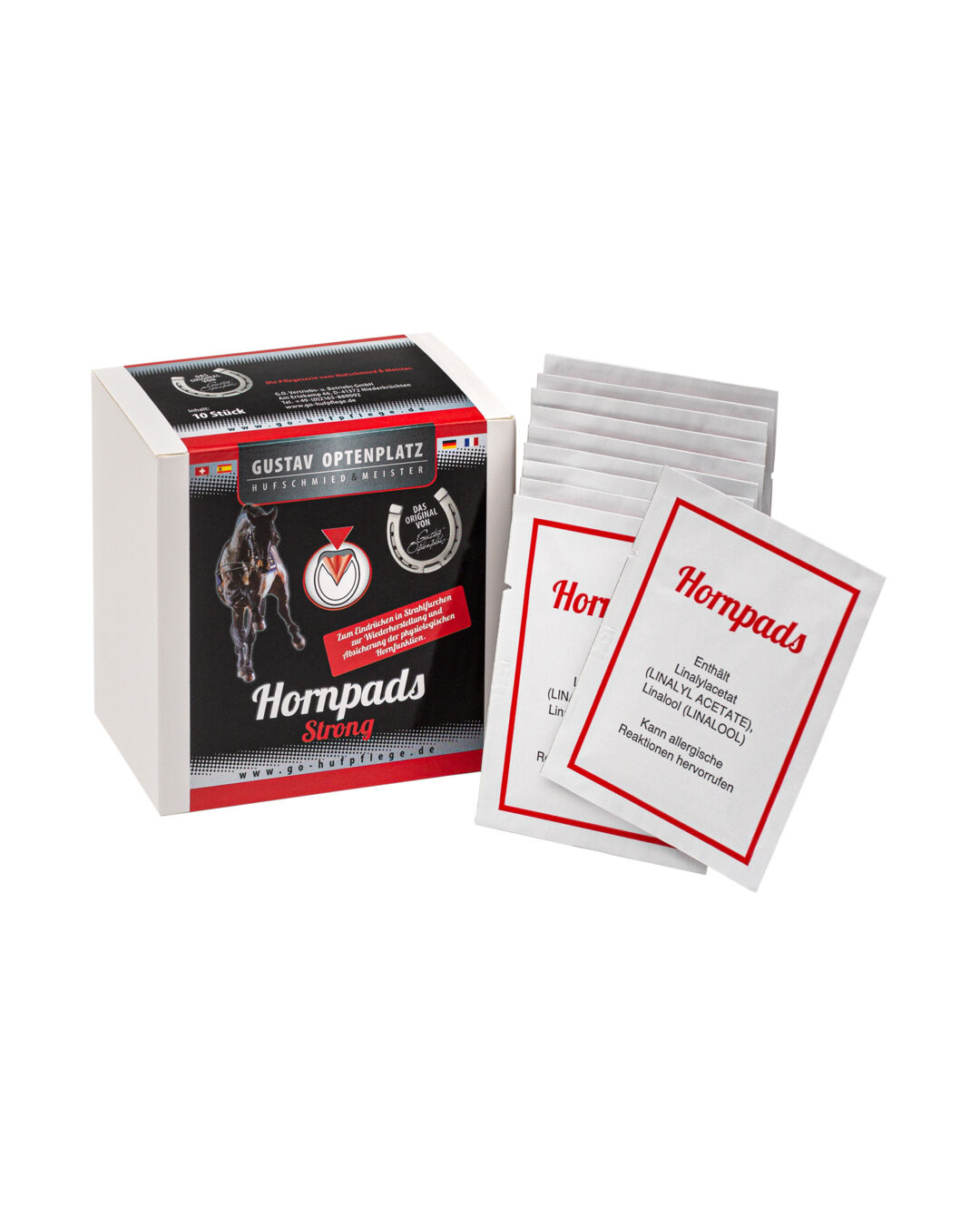 Die Gustav Optenplatz Hornpads Strong werden bei Strahlfäule bzw. Rissen und Löchern (hohle Wand) unterschiedlicher Ursachen eingesetzt. Die Pads sind mit einer Lösung getränkt, welche starke Desinfektion mit perfekter Pflege verbindet. Das antimikrobiell wirkende Alumen (Alaun) ist mit pflegendem Glycerin im Komplex verbunden. Dies hat zu Folge, dass seine sehr starke Wirkung gegen Erreger, insbesondere solche, wie sie bei Strahlfäulevorkommen entsteht, ohne dass Austrocknungen zu befürchten sind. Das Horn behält seine Elastizität. Sie werden bereits nach einigen Tagen eine deutliche Verbesserung feststellen.