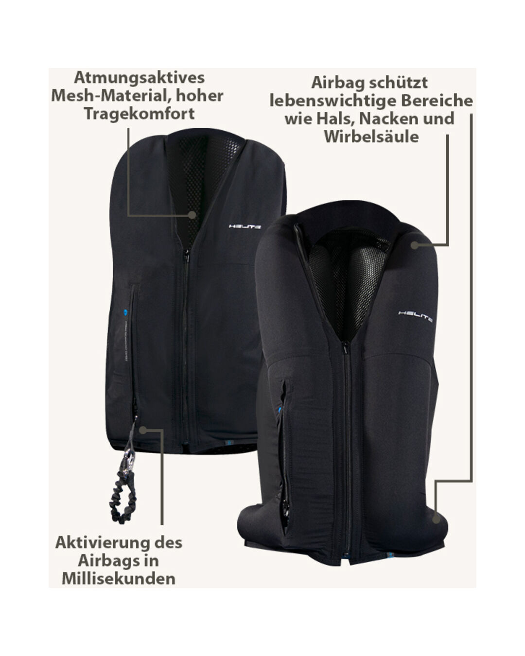 Helite hat sich im Reitsport mit seinen tragbaren Airbag-Systemen etabliert. Die Airbag-Jacken und -Westen bieten zuverlässigen Schutz bei Unfällen mit dem Pferd, sowohl für Erwachsene als auch Kinder. Ob Gelände, Dressur oder Freizeit – Helite sorgt für Sicherheit und Komfort im Reitsport.