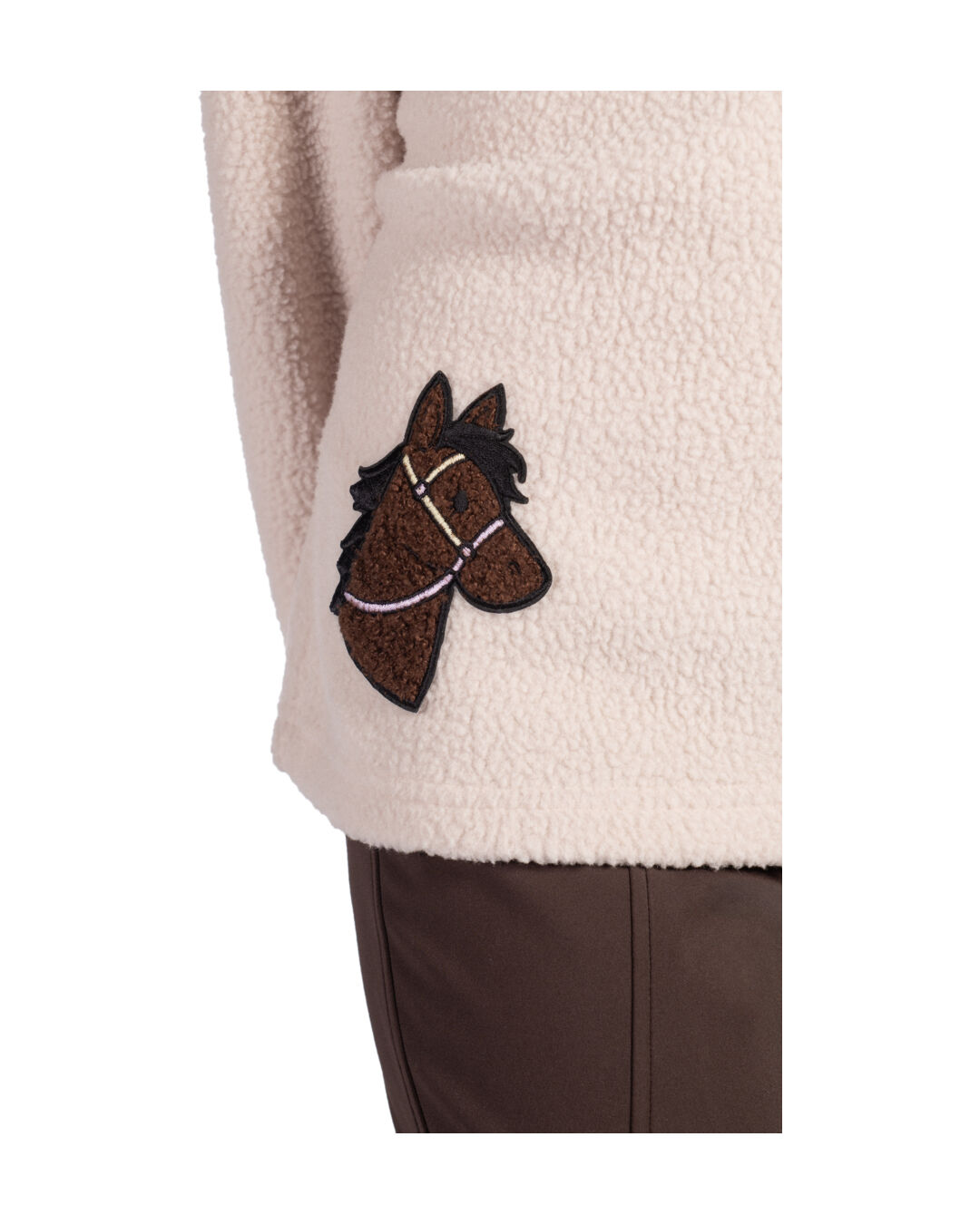 Gefertigt aus weichem Teddyfell bietet er eine besonders hohe Wärmehaltung und fühlt sich angenehm auf der Haut an. Der Stehkragen mit Reißverschluss schützt zusätzlich vor Kälte und lässt sich mit dem farbigen Anhänger leicht öffnen und schließen – auch für Kinderhände praktisch. Als verspieltes Detail sorgt die Pferdekopf-Applikation auf der Vorderseite für einen liebevollen Akzent.