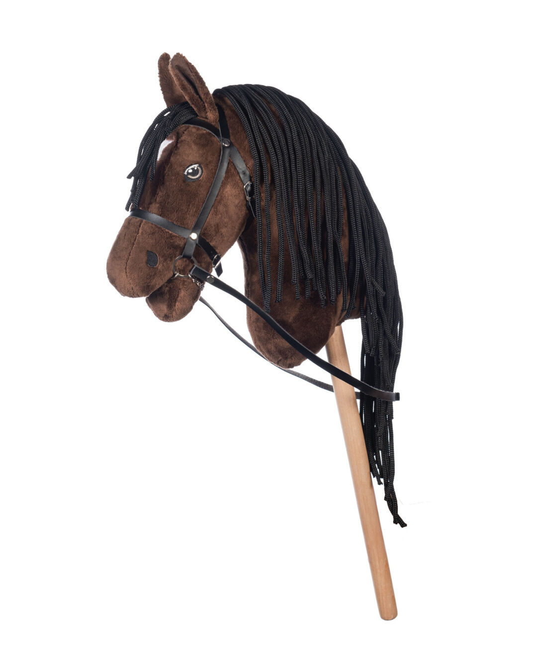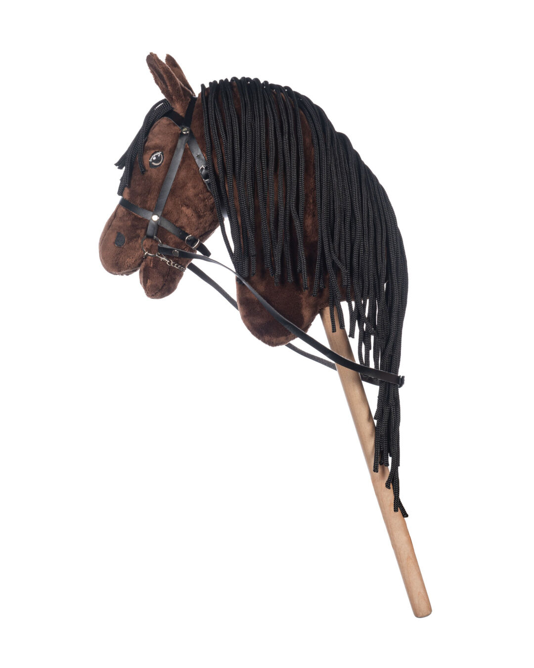 Eine Besonderheit dieses Steckenpferdes ist die Trense, die unterhalb der Ohren angebracht und bei Bedarf vorsichtig mit einer Schere entfernt werden kann. Eine 40 cm lange Holzstange dient als Griff und bietet zusätzliche Stabilität beim Spielen.