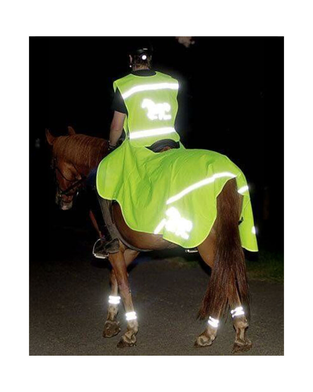 Diese reflektierende Ausreitdecke schützt nicht nur vor Wind und Wetter, sondern sorgt durch ihre auffälligen Reflexstreifen für erhöhte Sichtbarkeit und Sicherheit im Straßenverkehr.