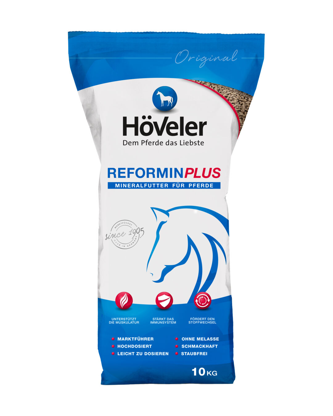 Die Rezeptur vom ReforminPlus unterstützt alle Stoffwechselprozesse im Körper deines Pferdes – die Vitalität und das Leistungsvermögen hängt wesentlich von der bedarfsgerechten Versorgung ab. Deshalb gehört ReforminPlus als fester Bestandteil in jede Futterration. Insbesondere in Phasen, in denen die gesamten Stoffwechselvorgänge intensiviert sind. Dazu zählen u. a. starke Belastungsphasen im Sport, Trächtigkeit sowie die Fohlenaufzucht.