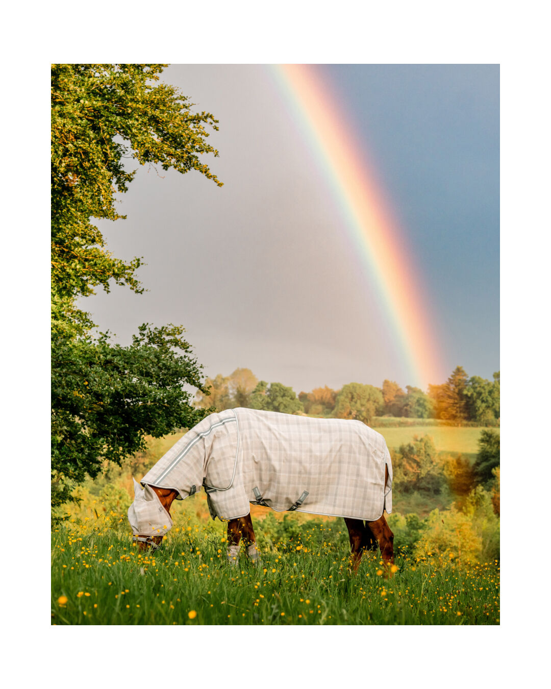 Das Design mit dem klassischen Witney-Streifenmuster verleiht der Decke einen edlen Look, während durchdachte Details für perfekten Sitz und hohen Komfort sorgen. Die besonders große Schweifklappe hält lästige Insekten fern, während der abnehmbare Halsteil zusätzlichen Schutz für den Halsbereich bietet. Die doppelten Beinausschnitte erlauben maximale Bewegungsfreiheit, während der gerade Brustverschluss und die Kreuzbegurtung für sicheren Halt sorgen.