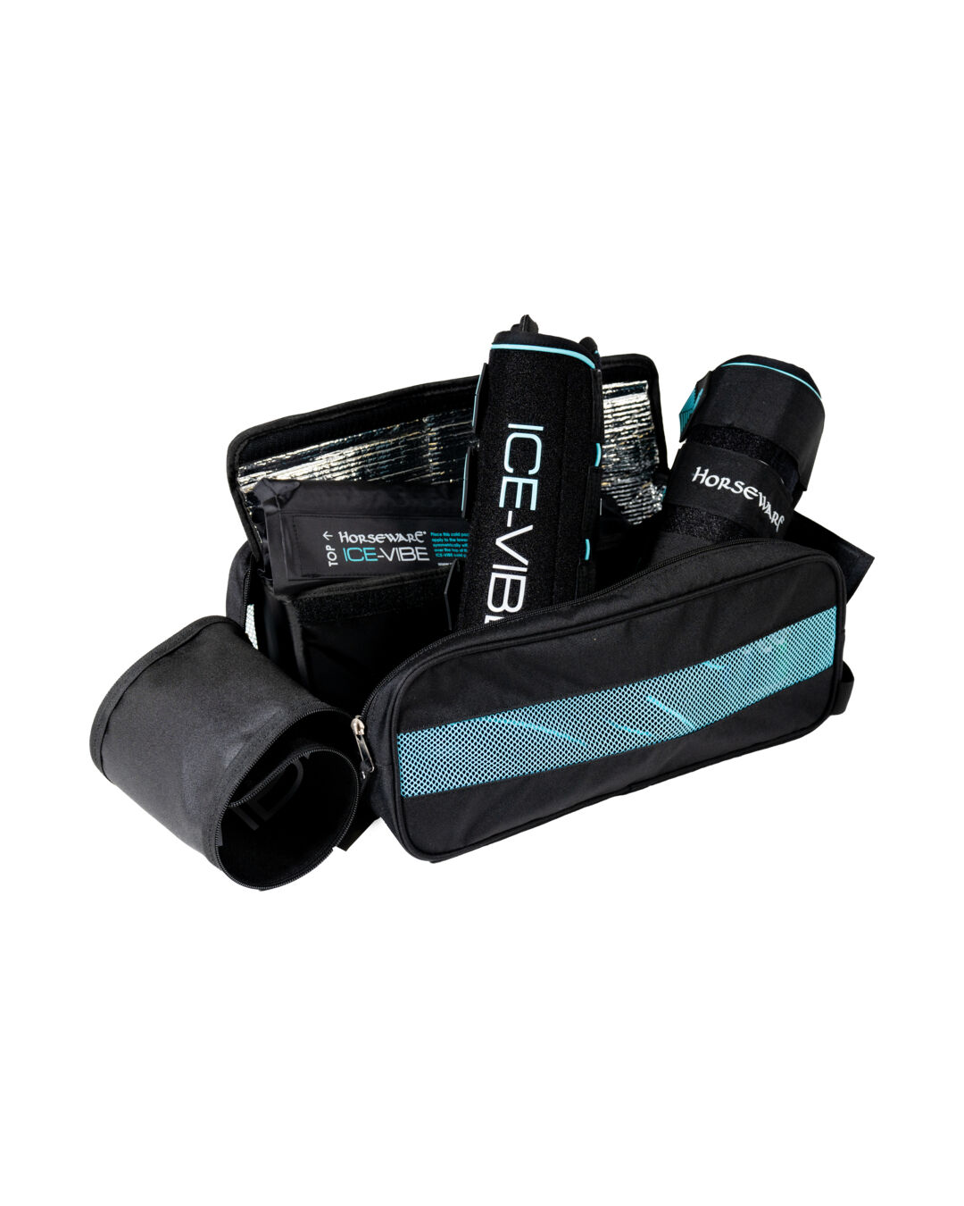 Das Set ist für Vorder- und Hinterbeine geeignet und kommt inklusive Akku, Ladegerät und Gelpacks – also alles dabei für Stall, Turnier oder Reha.