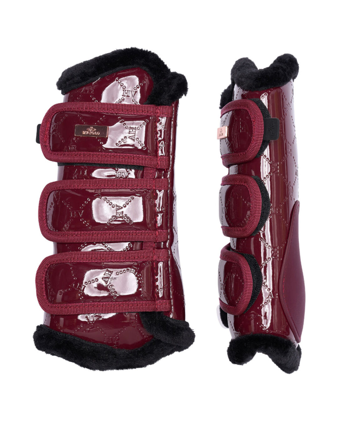 Die HV Polo Dressur Gamasche ist eine klassische Gamasche in einer eleganten Lack-Optik mit einer wabenförmigen Absteppung. Die HV Polo Gamasche ist mit einer Kunstpelzkante versehen. Das Metallmarkenschild ist am oberen Verschlussriemen angebracht.