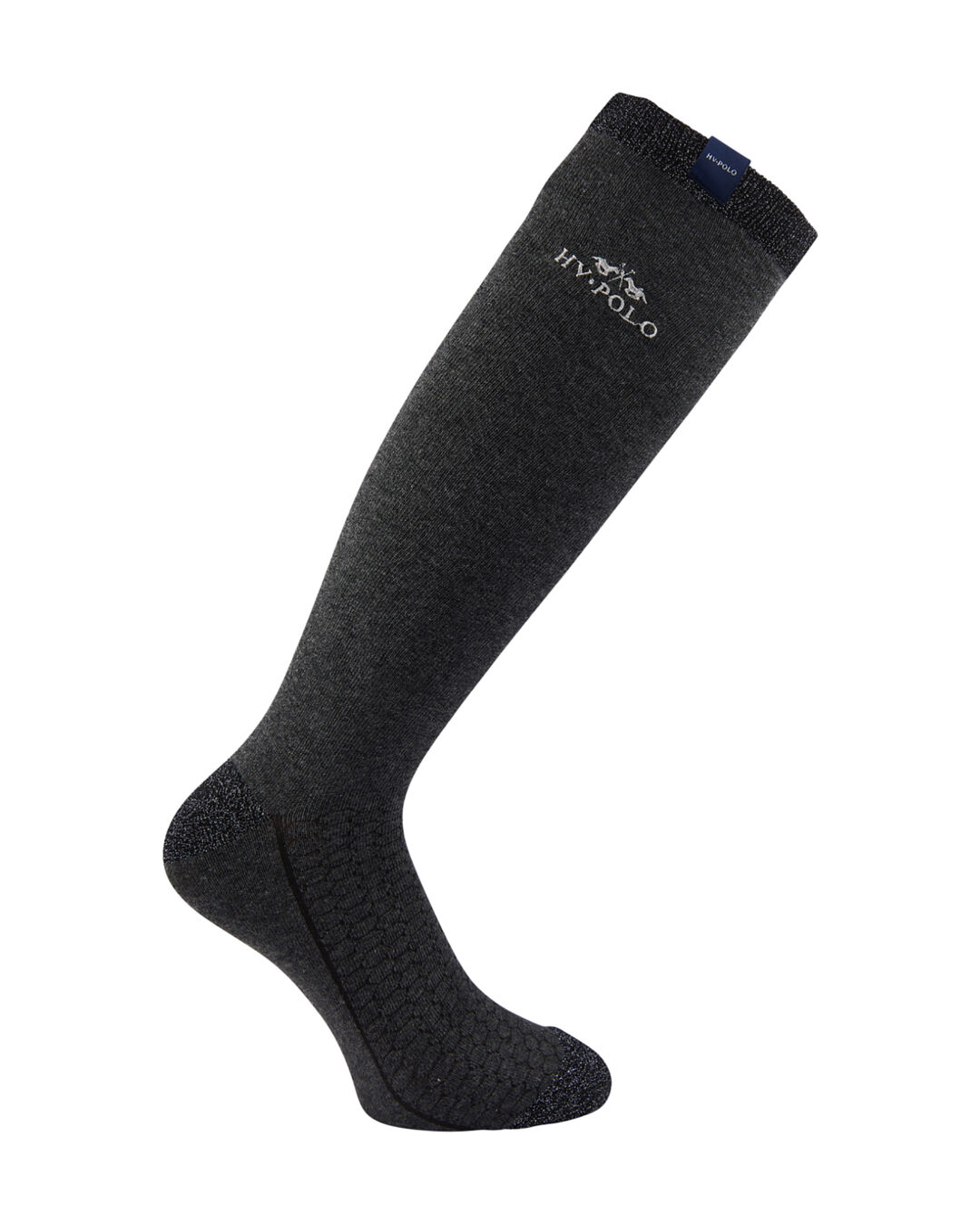 Die Socken HVPSaar von HV Polo haben eine Stickerei aus silberfarbenem Lurexgarn am oberen Ende und ein Waffelmuster auf der Fußoberseite. Sie sind mit kleiner Lurex-Rippung ausgestattet.