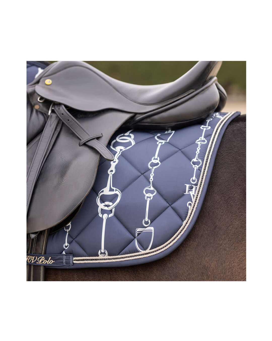 Diese Schabracke besticht durch ihre große Quadratsteppung und den luxuriösen All-Over-Aufdruck mit Markenlogo. Schicke Schnüre und Strasssteine entlang der Einfassung verleihen der Schabracke einen edlen Touch. Der Netzrücken sorgt für optimale Luftzirkulation und Atmungsaktivität.