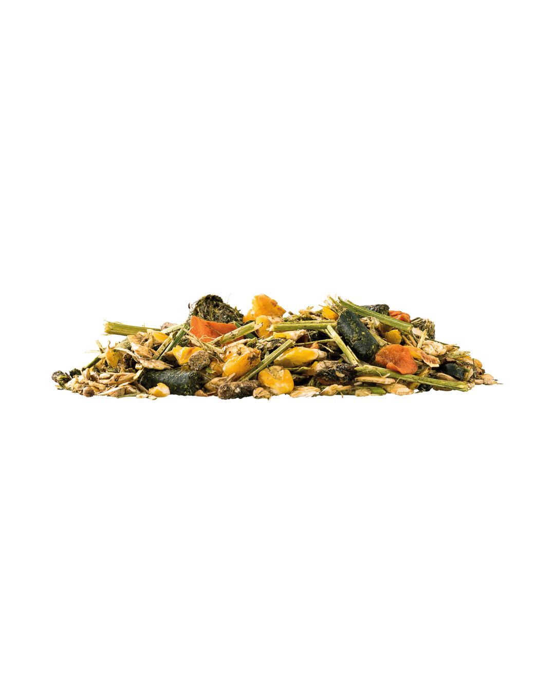 Strukturliefernde Luzerne und kernige, hochaufgeschlossene Gerstenflocken regen die Kauaktivität an und fördern eine gesunde Verdauung. Die Kombination aus leckerem Apfeltrester und Karottenstücken macht dieses Futter besonders schmackhaft – auch für mäkelige Pferde. Der reduzierte Stärkegehalt und lediglich 4,6 % Zucker machen es außerdem gut verträglich für Pferde mit empfindlichem Magen-Darm-Trakt oder niedrigem Energiebedarf.