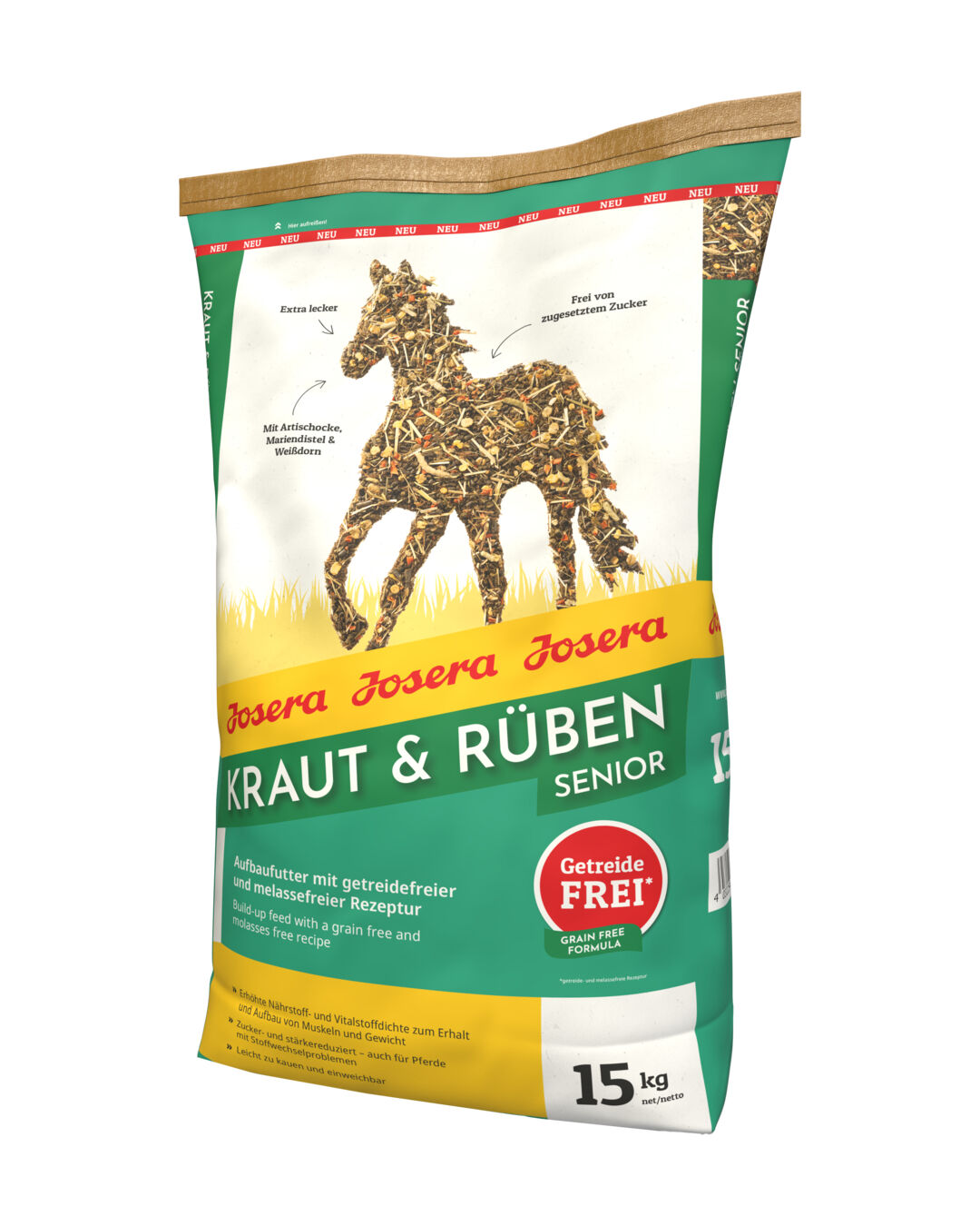 Mit dem Kraut & Rüben Senior von Josera versorgst du dein älteres Pferd rundum – abgestimmt auf die speziellen Bedürfnisse eines Pferdes, das zwar ruhiger geworden ist, aber noch lange nicht zum alten Eisen gehört. Dieses getreidefreie, melassefreie Strukturmüsli ist genau das Richtige, wenn du auf eine stoffwechselschonende, aber nährstoffreiche Fütterung setzen willst.