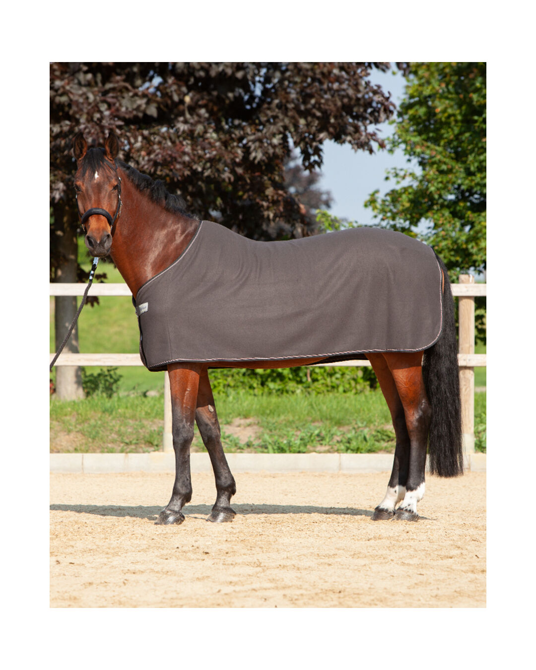 Dank des leichten Polyesterfleece-Materials bietet die Abschwitzdecke einen ausgezeichneten Feuchtigkeitstransport. Sie nimmt den Schweiß auf und leitet ihn effektiv nach außen, sodass das Pferd nach dem Training ausdampfen kann, ohne zu unterkühlen. Die Decke ist speziell so konstruiert, dass sie eine sehr gute Passform bietet, unterstützt durch die formstabile Rückennaht.