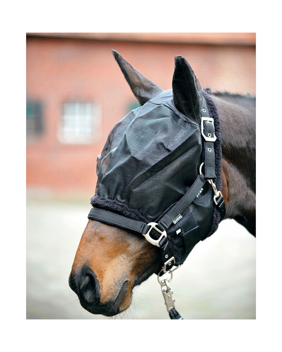 Hergestellt aus engmaschigem, festem Netzgewebe, schützt diese Fliegenmaske die empfindlichen Augen und Ohren deines Pferdes effektiv vor kleinen Insekten. Der elastische Bund mit einer Einfassung aus Kunstlamm sorgt dafür, dass die Maske eng am Kopf deines Pferdes anliegt, ohne unangenehme Druckstellen zu verursachen.