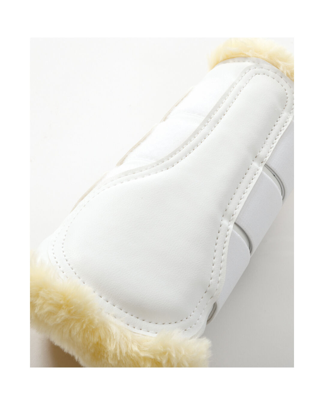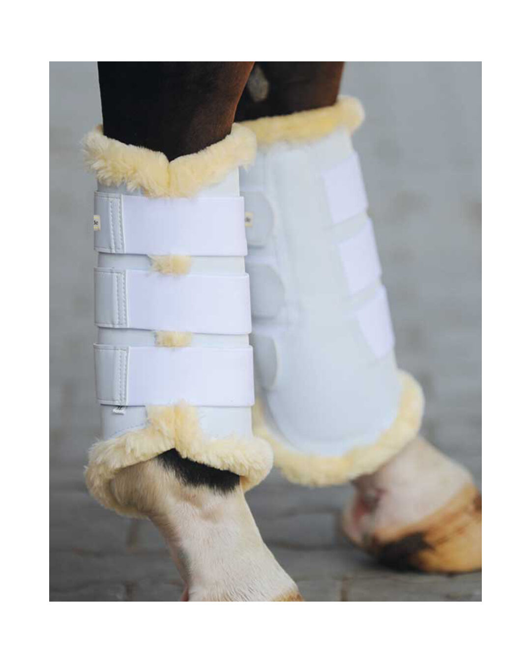 Die Innenseite dieser Gamaschen ist aus weichem Kunstfell gefertigt, was sie besonders für empfindliche Pferdebeine geeignet macht, die zu Scheuerstellen neigen. Die Außenseite besteht aus robustem Kunstleder, was diese Gamaschen zu einer 100 % veganen Option macht. Durch die drei verstellbaren Klettverschlüsse lassen sich die Gamaschen perfekt an das Bein des Pferdes anpassen und bieten so sicheren und komfortablen Halt.