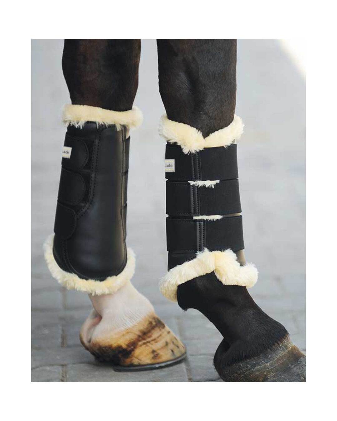 Die Innenseite dieser Gamaschen ist aus weichem Kunstfell gefertigt, was sie besonders für empfindliche Pferdebeine geeignet macht, die zu Scheuerstellen neigen. Die Außenseite besteht aus robustem Kunstleder, was diese Gamaschen zu einer 100 % veganen Option macht. Durch die drei verstellbaren Klettverschlüsse lassen sich die Gamaschen perfekt an das Bein des Pferdes anpassen und bieten so sicheren und komfortablen Halt.