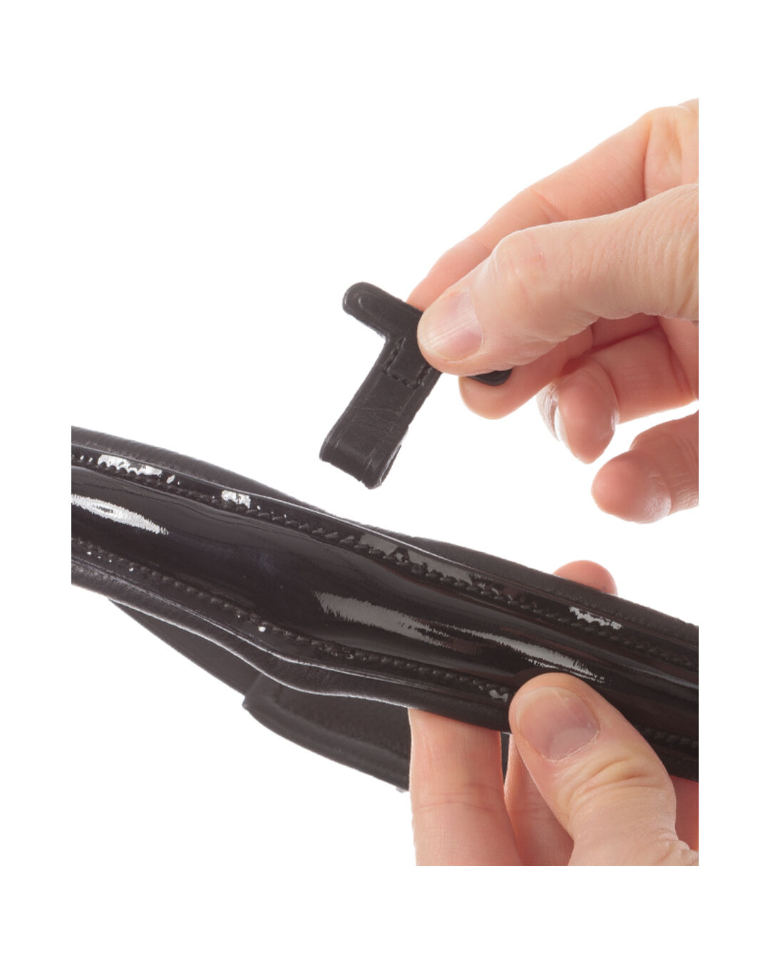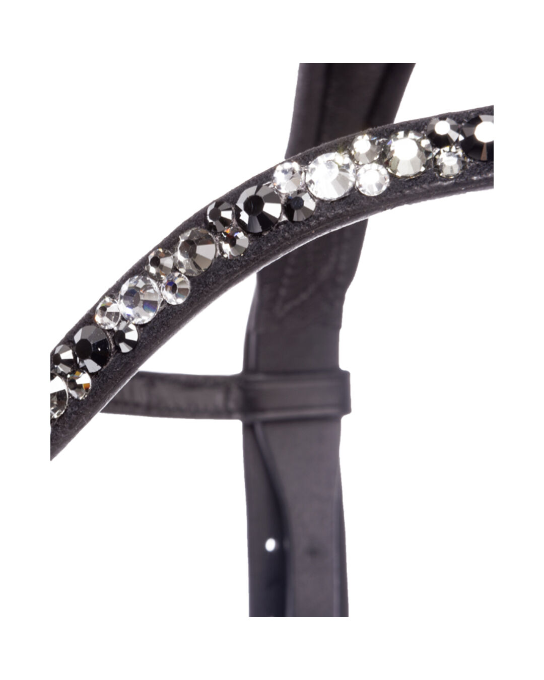 Die Trense verfügt über dezente Lackdetails auf Nasenriemen, Backenstück und Stirnband, die ihr ein elegantes Aussehen verleihen. Das extra breite Genickstück bietet genügend Freiraum für die Ohren, während das gebogene Strassstirnband für einen funkelnden Akzent sorgt. Komplettiert wird das Set durch schmale gummierte Zügel mit Stegen, die für einen sicheren Griff sorgen.