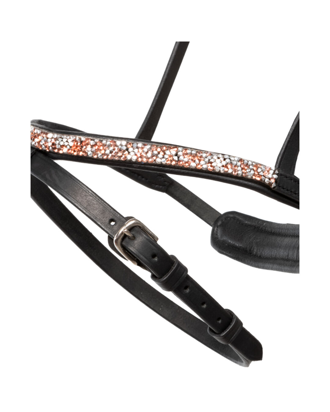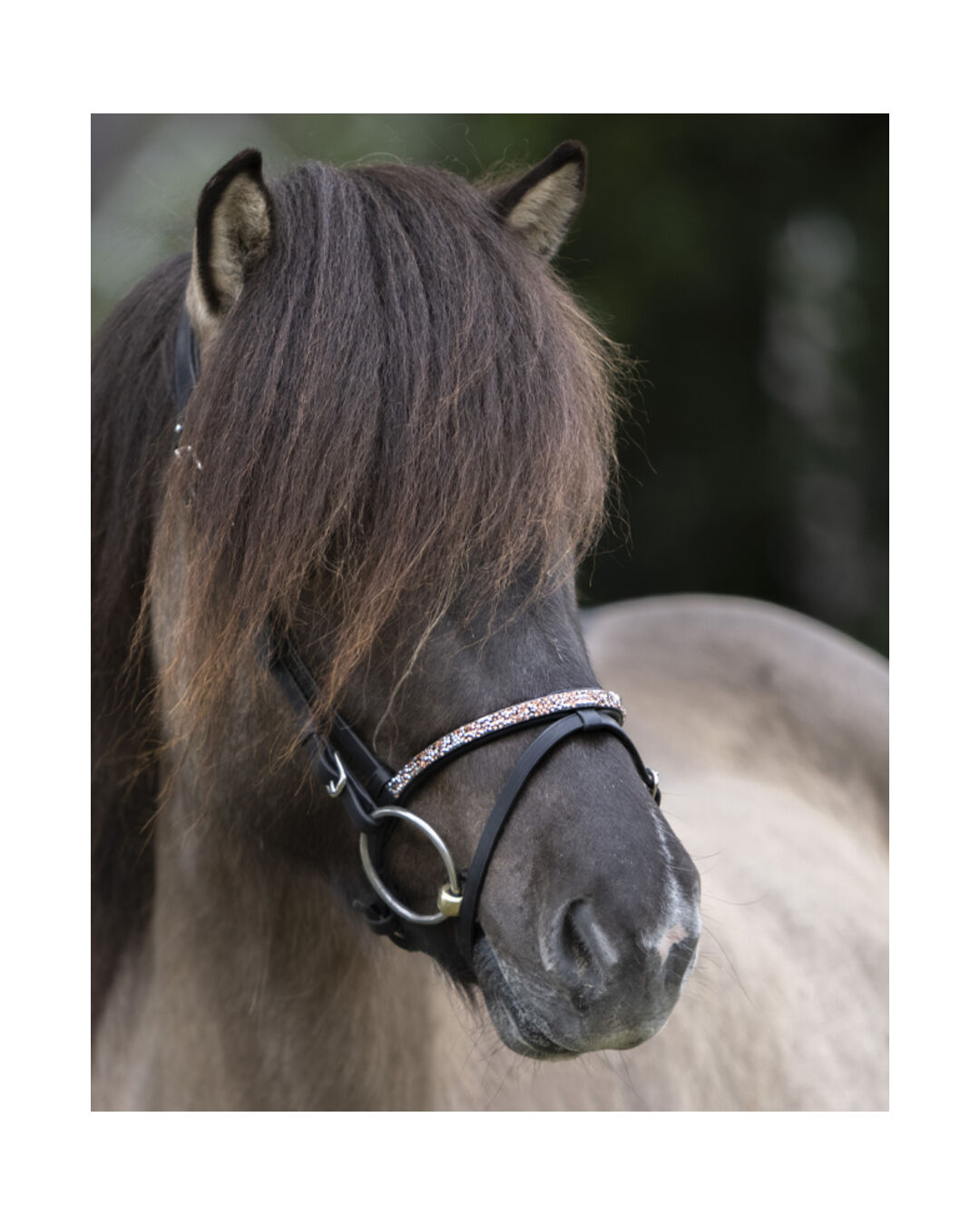 Das englische Reithalfter Ferskja von Kavalkade ist mit kleinen weißen und roséfarbenen Steinchen verziert, was ihm ein elegantes und stilvolles Aussehen verleiht.