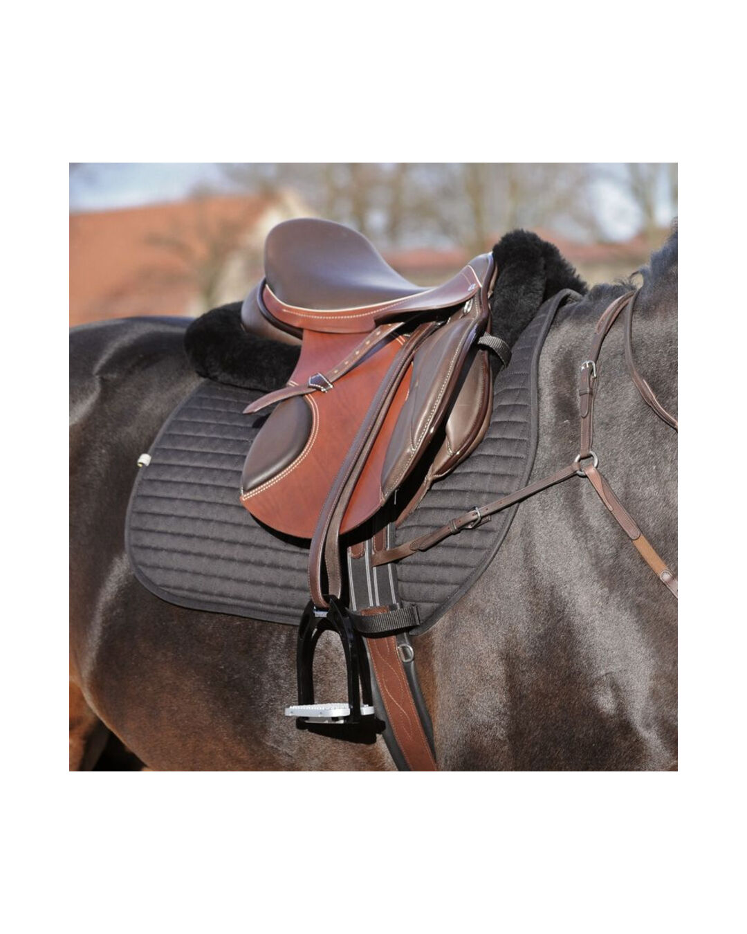 Diese hochwertige Sattelunterlage besteht aus echtem Lammfell, das sowohl antiallergisch als auch antiseptisch ist, wodurch sie auch für Pferde mit empfindlicher Haut geeignet ist. Das Lammfell fördert die Durchblutung in den Muskeln und sorgt durch seine natürliche Struktur für eine Massage des Pferderückens während des Reitens. Dank der einzigartigen Eigenschaften des Lammfells entsteht unter dem Sattel kein Hitzestau und es bietet eine ausgezeichnete Temperaturregulierung. Das Pad ist besonders formstabil, was bedeutet, dass es nach dem Reiten seine ursprüngliche Form beibehält und dadurch sehr stoßabsorbierend ist.