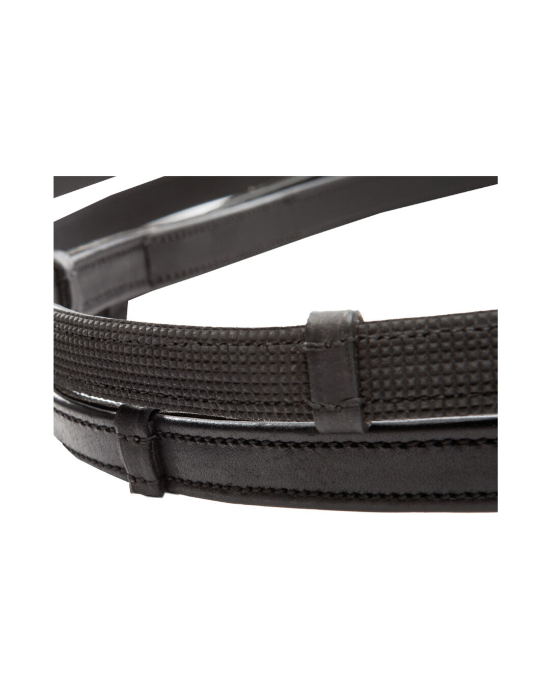 Die Vorderseite der Zügel ist aus weichem Leder gefertigt, während die Rückseite eine gummierte Beschichtung besitzt, die für optimalen Grip sorgt. Diese Kombination gewährleistet eine hervorragende Handhabung und Stabilität, selbst wenn die Zügel nass oder verschwitzt sind. Die schmale Ausführung mit einer Breite von nur 16 mm bietet eine elegante Optik und ein feines Handling.