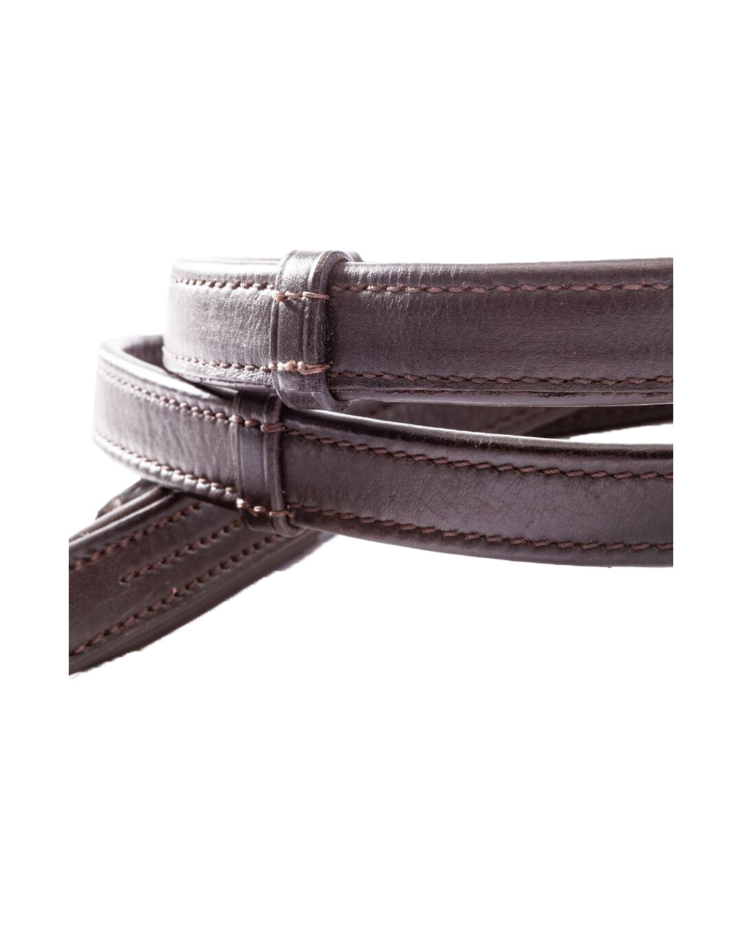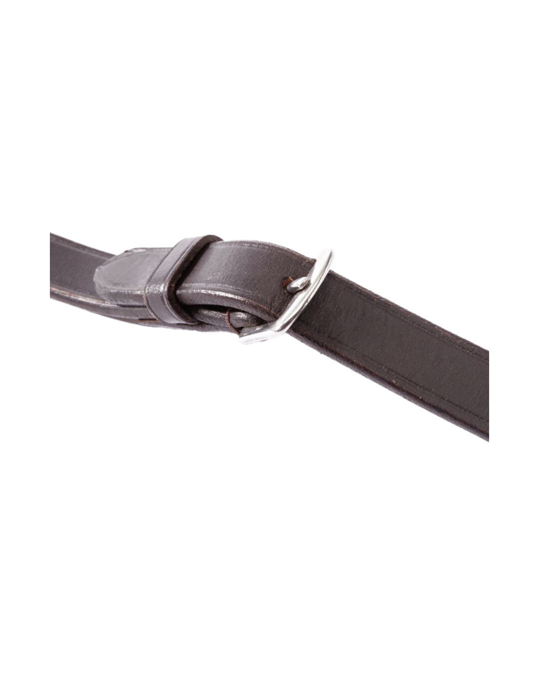 Diese Zügel sind aus hochwertigem, weichem Leder gefertigt und liegen besonders angenehm in der Hand. Dank der runden Nähte und der schmalen Ausführung mit einer Breite von nur 16 mm garantieren die Zügel eine hervorragende Kontrolle und ein feines Gefühl für das Pferdemaul. Ausgestattet mit praktischen Zaumhaken für eine einfache Befestigung und fünf Stegen zur optimalen Handpositionierung, sind diese Zügel sowohl funktional als auch stilvoll.