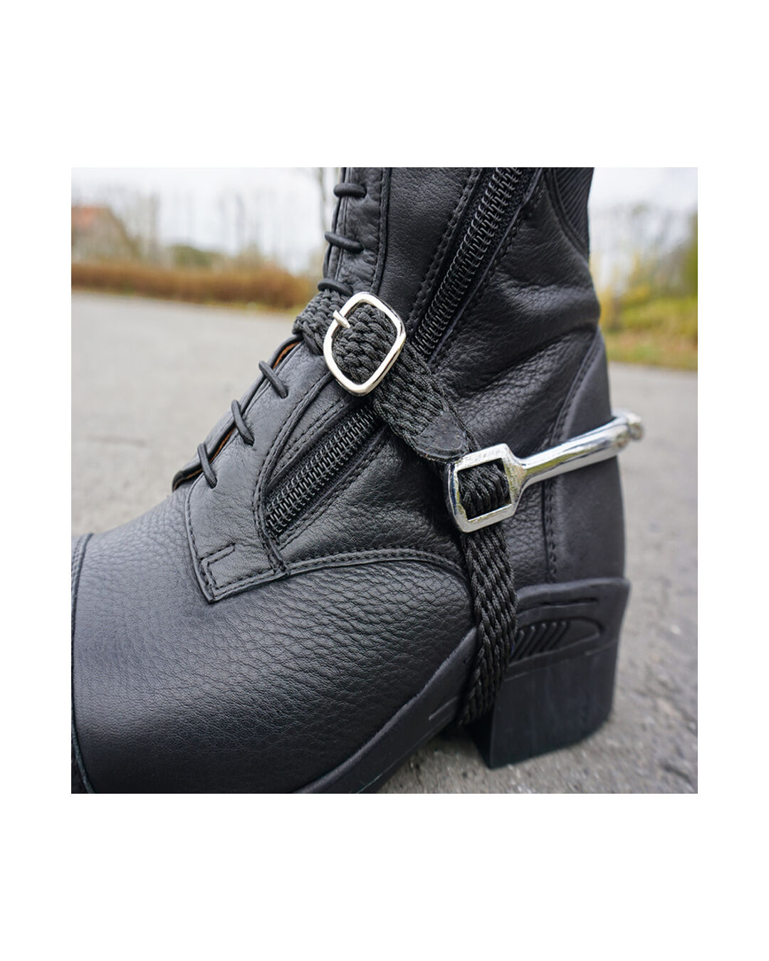 Diese Sporenriemen aus geflochtenem Perlon zeichnen sich durch ihr superweiches Material aus, das sich sanft an die Form deiner Stiefeletten oder Reitstiefel anpasst und das Leder schützt. Die Schnalle ermöglicht deine individuelle Größeneinstellung.