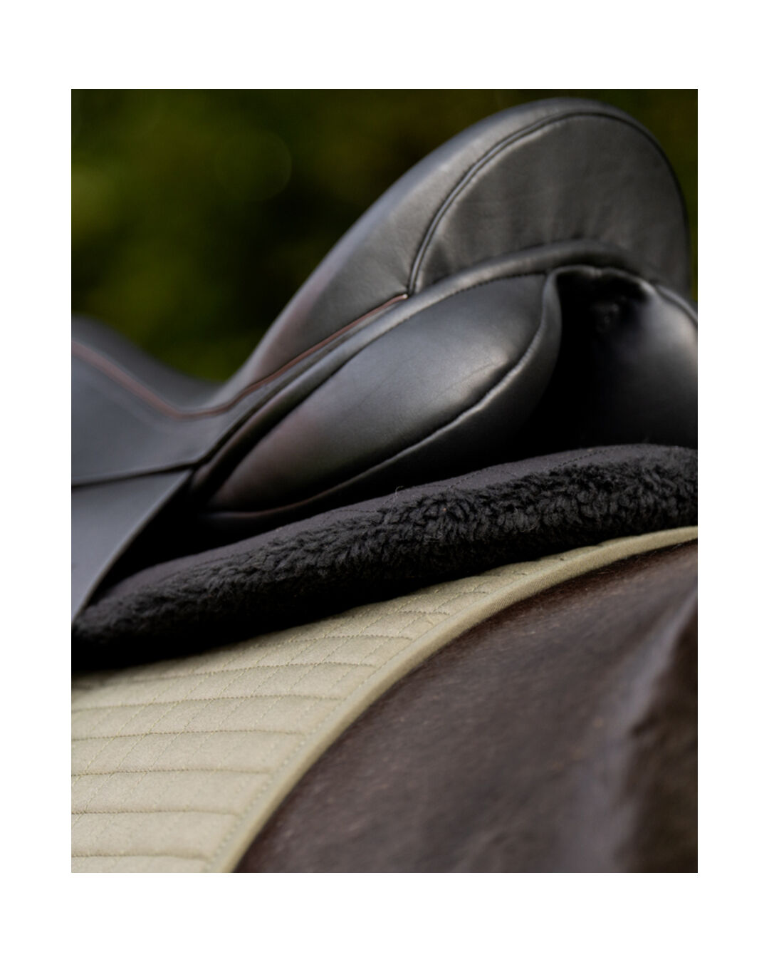 Das Kissen ist im hinteren Bereich erhöht, was besonders beim Springen den Rücken des Pferdes unterstützt und zusätzlichen Schutz bietet. Das Obermaterial besteht aus einem kleingesteppten Polyestergemisch, das nicht nur langlebig, sondern auch leicht zu reinigen ist. Die Unterseite aus Kunstfell bietet eine weiche Polsterung und verhindert Scheuern, während die Einlage aus Schaum und Watte für die optimale Druckverteilung und Stoßabsorption sorgt.