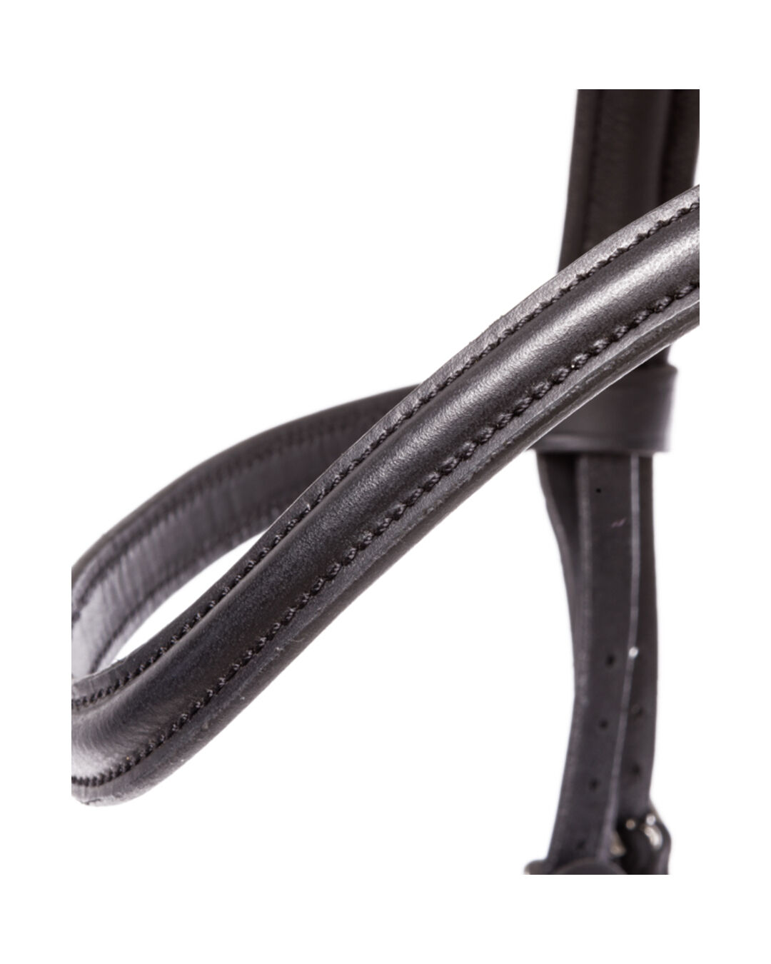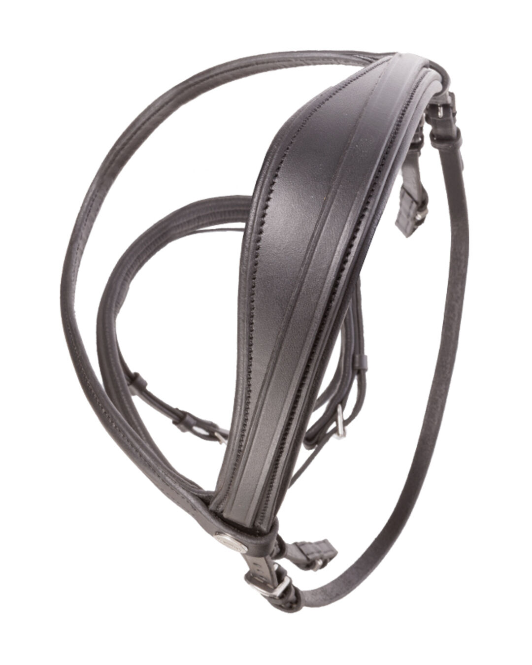 Sie kombiniert das klassische englisch-kombinierte Reithalfter mit einem innovativen überlaufenden Design, das die Notwendigkeit mehrfacher Verschnallungen reduziert. Das anatomisch geformte und weich gepolsterte Genickstück unterstützt den Tragekomfort, während das schlichte gerade Stirnband Eleganz ausstrahlt.
