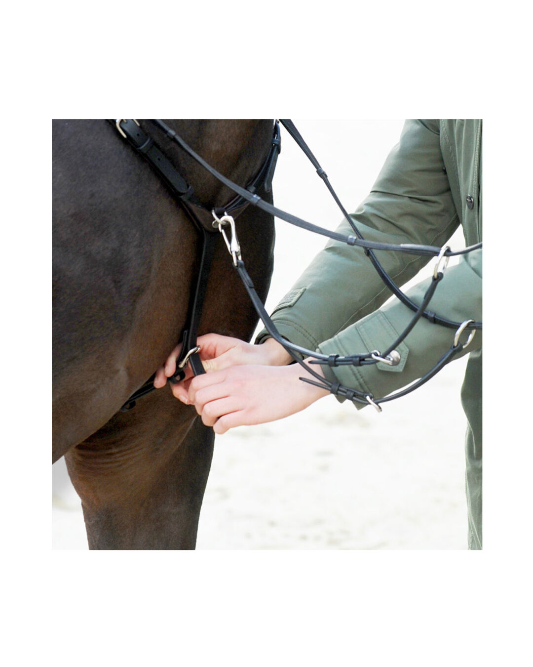 Der Brustgurt ist vorne verstellbar und lässt sich dank kleiner Lederschlaufe oder abnehmbarem Karabiner flexibel am Sattelgurt fixieren. Ein funktionales Lederzubehör für den täglichen Einsatz im Training oder Gelände.