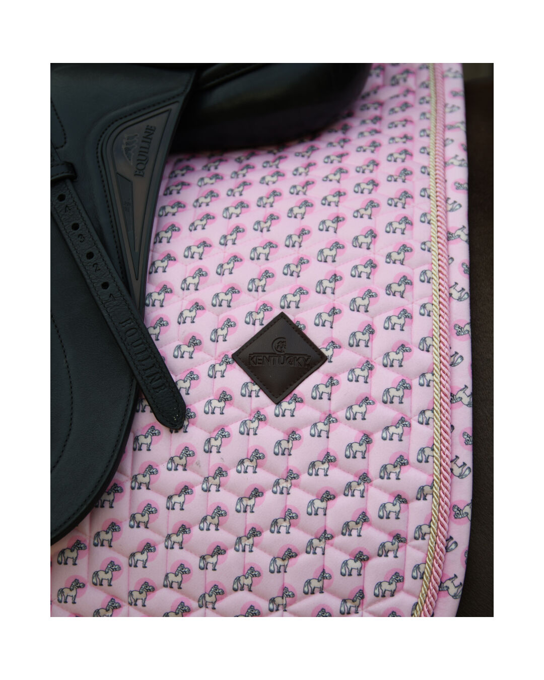 Statt klassischer Befestigungsriemen verfügt die Schabracke über einen einzigen Nylonriemen für den Sattelgurt, wodurch sie optimal an ihrem Platz bleibt. Das vegan lederne Kentucky-Logo bietet genug Platz, falls du die Schabracke individuell besticken lassen möchtest.
