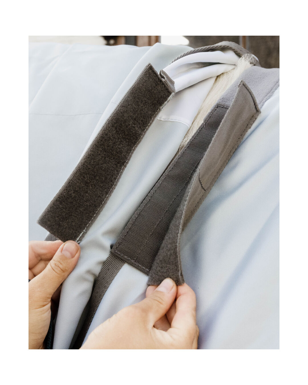 Das Halsteil reicht bis zu den Ohren und wird mit fünf Klettverschlüssen sicher fixiert. Der Bauchlatz bietet zusätzlichen Rundumschutz und wird mit drei stabilen Gurten befestigt. Der verlängerte Schweiflatz schützt bis zum Schweifansatz, ein elastischer Schweifriemen hält die Decke an Ort und Stelle – selbst bei Bewegung.